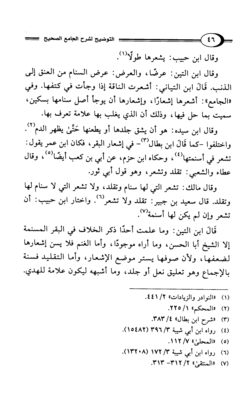 قَالَ ابن التين: وما علمت أحدًا ذكر الخلاف في البقر المسنمة إلا الشيخ أبا الحسن، وما أراه موجودًا، وأما الغنم فلا يسن إشعارها لضعفها، ولأن صوفها يستر موضع الإشعار، وأما التقليد فسنة بالإجماع وهو تعليق نعل أو جلد، وما أشبهه ليكون علامة للهدي.