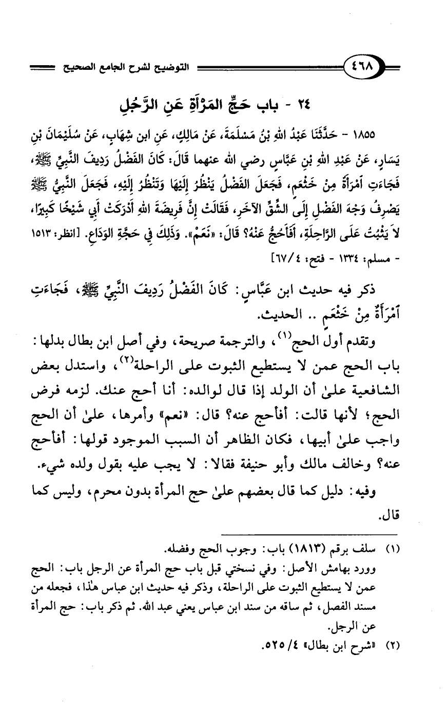 وورد بهامش الأصل: وفي نسختي قبل باب حج المرأة عن الرجل باب: الحج عمن لا يستطيع الثبوت على الراحلة، وذكر فيه حديث ابن عباس هذا، فجعله من مسند الفصل، ثم ساقه من سند ابن عباس يعني عبد الله. ثم ذكر باب: حج المرأة عن الرجل.