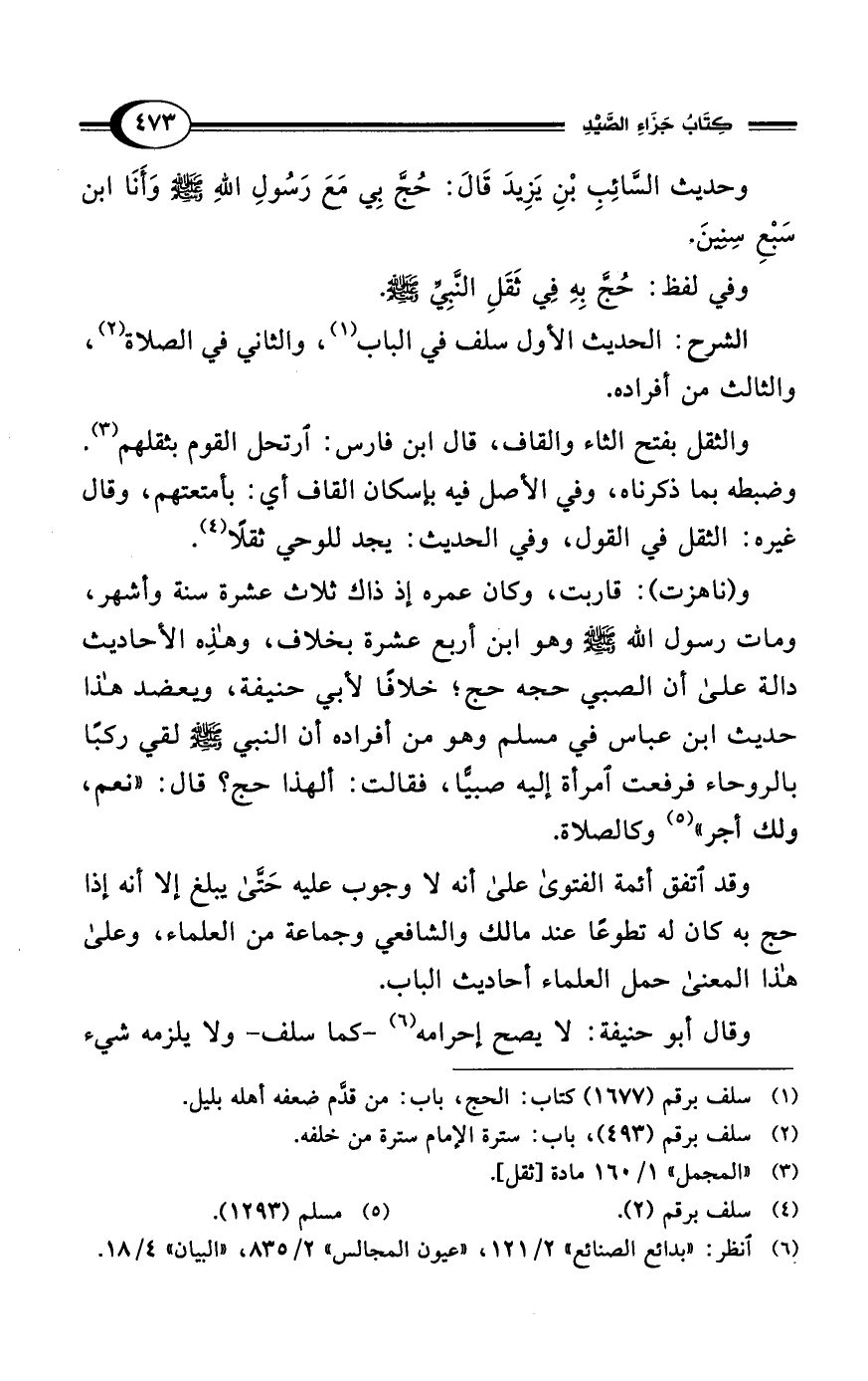 وحديث السَّائِبِ بْنِ يَزِيدَ قَالَ: حُجَّ بِي مَعَ رَسُولِ الله - صلى الله عليه وسلم - وَأَنَا ابن سَبْعِ سِنِينَ.