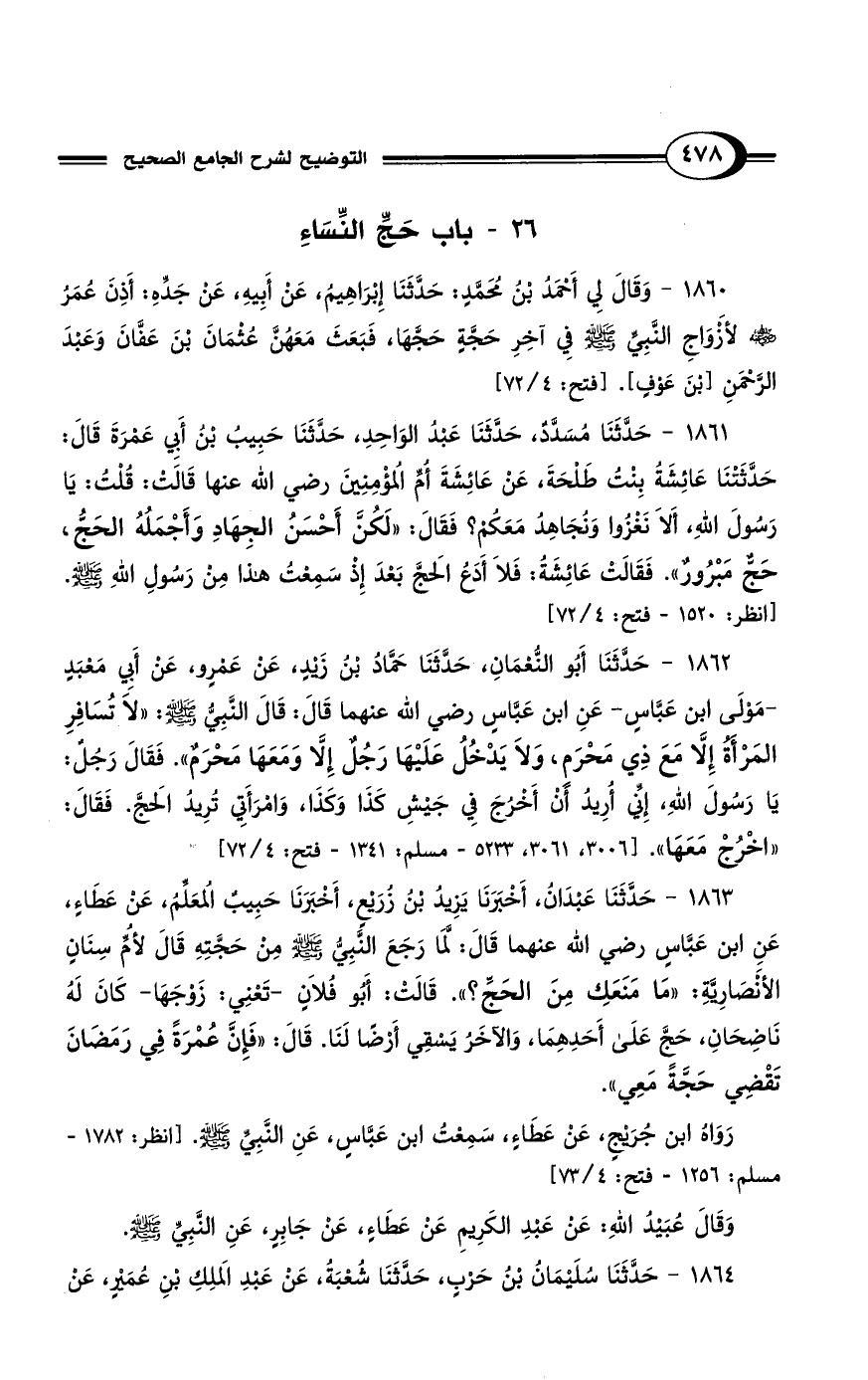 1861 - حَدَّثَنَا مُسَدَّدٌ، حَدَّثَنَا عَبْدُ الوَاحِدِ، حَدَّثَنَا حَبِيبُ بْنُ أَبِي عَمْرَةَ قَالَ: حَدَّثَتْنَا عَائِشَةُ بِنْتُ طَلْحَةَ، عَنْ عَائِشَةَ أُمِّ المُؤْمِنِينَ رضي الله عنها قَالَتْ: قُلْتُ: يَا رَسُولَ اللهِ، أَلاَ نَغْزُوا وَنُجَاهِدُ مَعَكُمْ؟ فَقَالَ: "لَكُنَّ أَحْسَنُ الجِهَادِ وَأَجْمَلُهُ الحَجُّ، حَجٌّ مَبْرُورٌ". فَقَالَتْ عَائِشَةُ: فَلاَ أَدَعُ الحَجَّ بَعْدَ إِذْ سَمِعْتُ هَذَا مِنْ رَسُولِ اللهِ - صلى الله عليه وسلم -. [انظر: 1520 - فتح: 4/ 72]