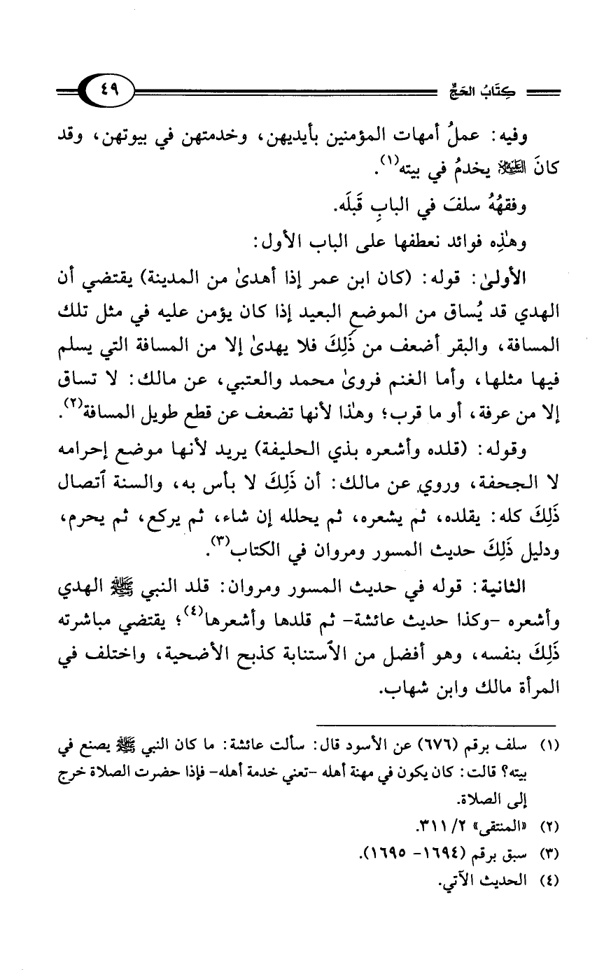 الأولى: قوله: (كان ابن عمر إذا أهدى من المدينة) يقتضي أن الهدي قد يُساق من الموضع البعيد إذا كان يؤمن عليه في مثل تلك المسافة، والبقر أضعف من لِكَ فلا يهدى إلا من المسافة التي يسلم فيها مثلها، وأما الغنم فروى محمد والعتبي، عن مالك: لا تساق إلا من عرفة، أو ما قرب؛ وهذا لأنها تضعف عن قطع طويل المسافة (¬2).