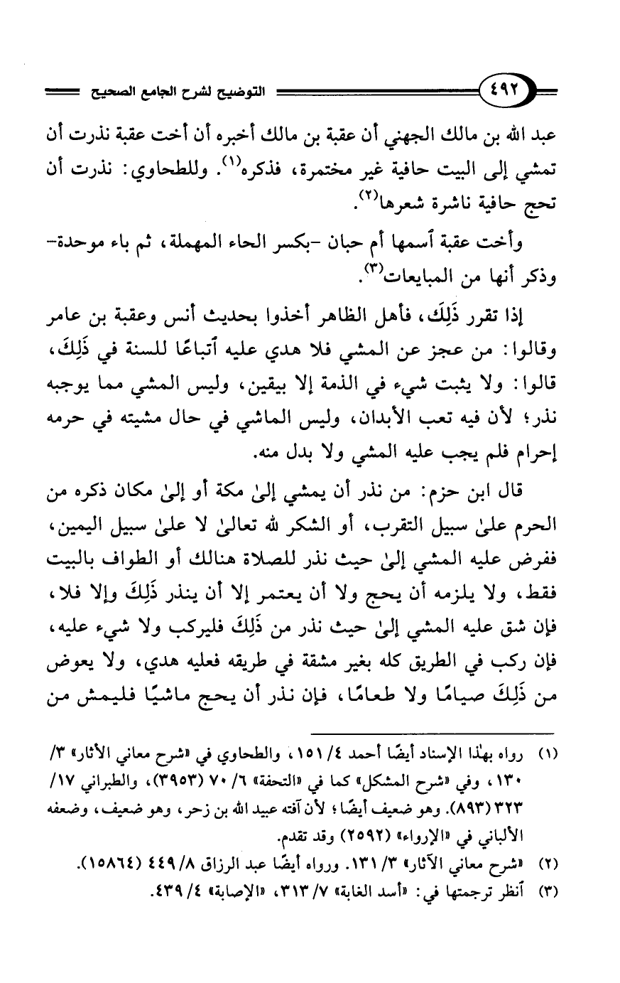 عبد الله بن مالك الجهني أن عقبة بن مالك أخبره أن أخت عقبة نذرت أن تمشي إلى البيت حافية غير مختصرة، فذكره (¬1). وللطحاوي: نذرت أن تحج حافية ناشرة شعرها (¬2).