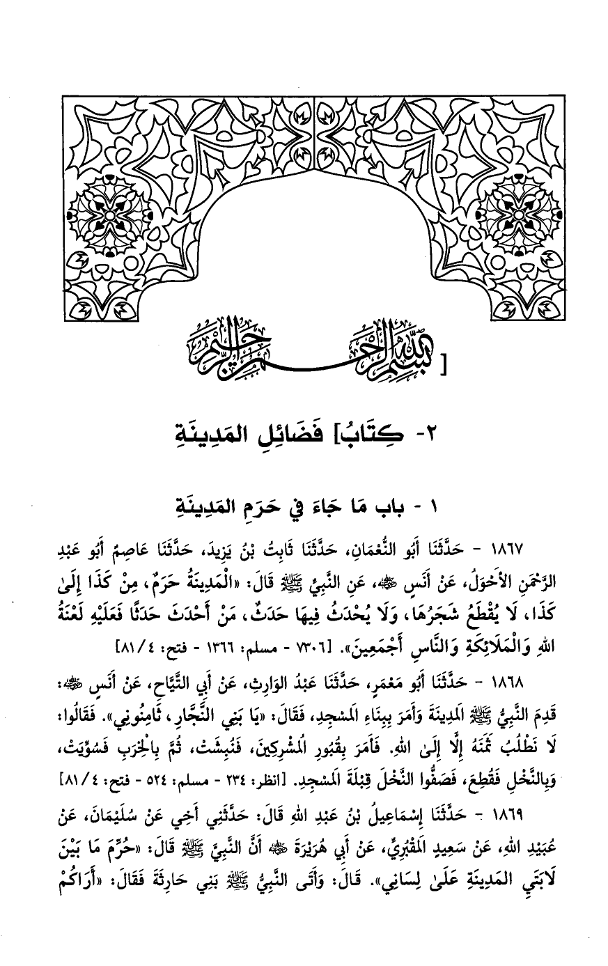1867 - حَدَّثَنَا أَبُو النُّعْمَانِ، حَدَّثَنَا ثَابِتُ بْنُ يَزِيدَ، حَدَّثَنَا عَاصِمٌ أَبُو عَبْدِ الرَّحْمَنِ الأَحْوَلُ، عَنْ أَنَسٍ - رضي الله عنه -، عَنِ النَّبِيِّ - صلى الله عليه وسلم - قَالَ: "المَدِينَةُ حَرَمٌ، مِنْ كَذَا إِلَى كَذَا، لَا يُقْطَعُ شَجَرُهَا، وَلَا يُحْدَثُ فِيهَا حَدَثٌ، مَنْ أَحْدَثَ حَدَثًا فَعَلَيْهِ لَعْنَةُ اللهِ وَالمَلاَئِكَةِ وَالنَّاسِ أَجْمَعِينَ". [7306 - مسلم: 1366 - فتح: 4/ 81]