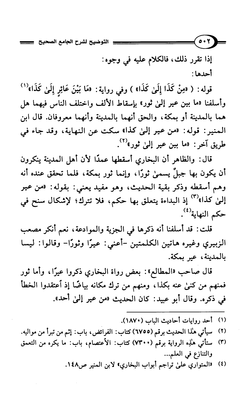 قلت: قد أسلفنا أنه ذكرها في الجزية والموادعة، نعم أنكر مصعب الزبيري وغيره هاتين الكلمتين -أعني: عيرًا وثورًا- وقالوا: ليسا بالمدينة، عير بمكة.