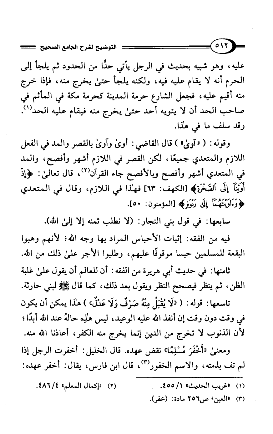 عليه، وهو شبيه بحديث في الرجل يأتي حدًّا من الحدود ثم يلجأ إلى الحرم أنه لا يقام عليه فيه، ولكنه يلجأ حتى يخرج منه، فإذا خرج منه أقيم عليه، فجعل الشارع حرمة المدينة كحرمة مكة في المأثم في صاحب الحد أن لا يئويه أحد حتى يخرج منه فيقام عليه الحد (¬1). وقد سلف ما في هذا.