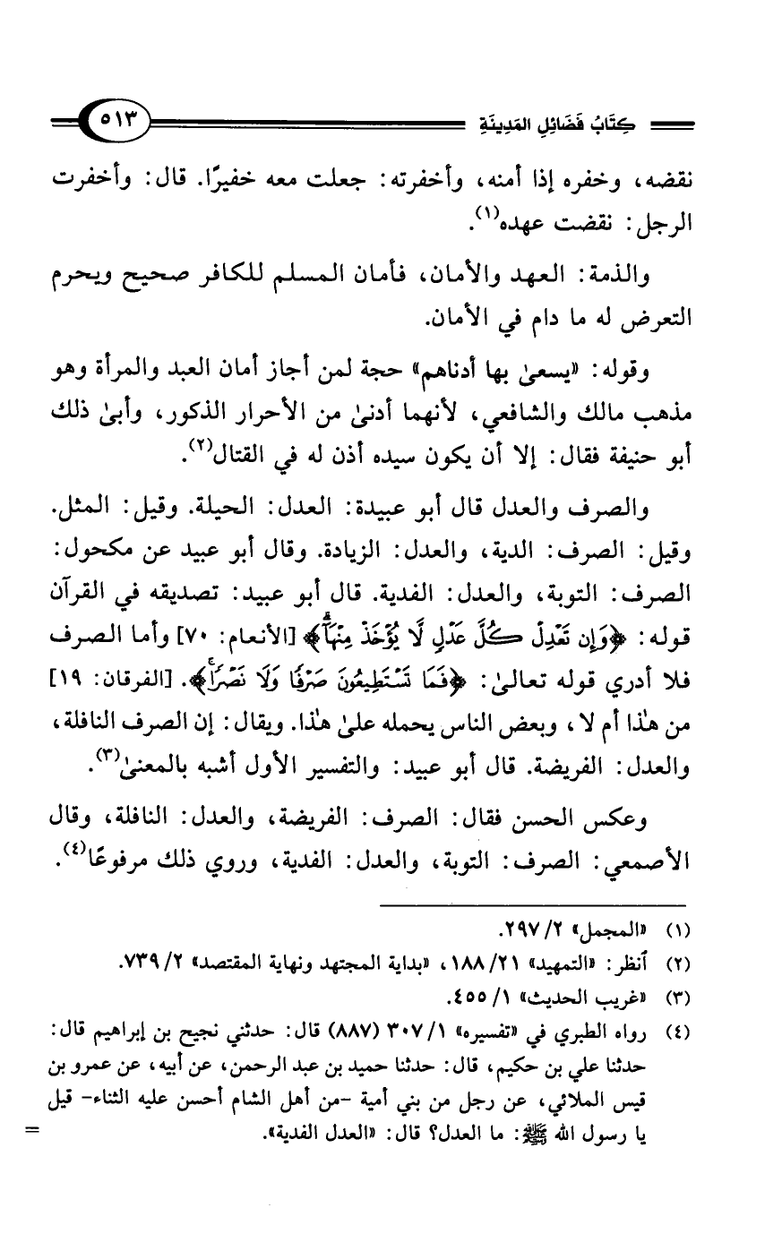 وقيل: الصرف: الدية، والعدل: الزيادة. وقال أبو عبيد عن مكحول: الصرف: التوبة، والعدل: الفدية. قال أبو عبيد: تصديقه في القرآن قوله: {وَإِنْ تَعْدِلْ كُلَّ عَدْلٍ لَا يُؤْخَذْ مِنْهَا} [الأنعام: 70] وأما الصرف فلا أدري قوله تعالى: {فَمَا تَسْتَطِيعُونَ صَرْفًا وَلَا نَصْرًا}. [الفرقان: 19] من هذا أم لا، وبعض الناس يحمله على هذا. ويقال: إن الصرف النافلة، والعدل: الفريضة. قال أبو عبيد: والتفسير الأول أشبه بالمعنى (¬3).