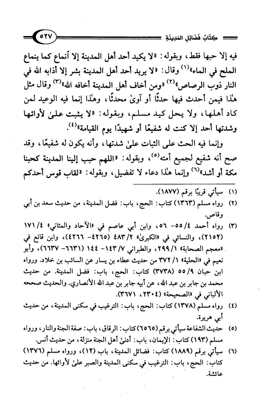 فيه إلا حبها فقط، وبقوله: "لا يكيد أحد أهل المدينة إلا انماع كما ينماع الملح في الماء" (¬1) وقال: "لا يريد أحد أهل المدينة بشر إلا أذابه الله في النار ذوب الرصاص" (¬2) "ومن أخاف أهل المدينة أخافه الله" (¬3) وقال مثل هذا فيمن أحدث فيها حدثًا أو آوى محدثًا، وهذا إنما فيه الوعيد لمن كاد أهلها، ولا يحل كيد مسلم، وبقوله: "لا يثبت على لأوائها وشدتها أحد إلا كنت له شفيعًا أو شهيدًا يوم القيامة" (¬4).