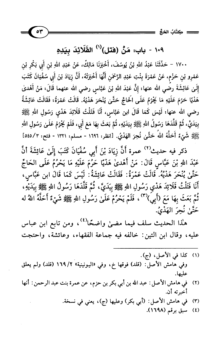 1700 - حَدَّثَنَا عَبْدُ اللهِ بْنُ يُوسُفَ، أَخْبَرَنَا مَالِكٌ، عَنْ عَبْدِ اللهِ بْنِ أَبِي بَكْرِ بْنِ عَمْرِو بْنِ حَزْمٍ، عَنْ عَمْرَةَ بِنْتِ عَبْدِ الرَّحْمَنِ أَنَّهَا أَخْبَرَتْهُ، أَنَّ زِيَادَ بْنَ أَبِي سُفْيَانَ كَتَبَ إِلَى عَائِشَةَ رضي الله عنها: إِنَّ عَبْدَ اللهِ بْنَ عَبَّاسٍ رضي الله عنهما قَالَ: مَنْ أَهْدَى هَدْيًا حَرُمَ عَلَيْهِ مَا يَحْرُمُ عَلَى الحَاجِّ حَتَّى يُنْحَرَ هَدْيُهُ. قَالَتْ عَمْرَةُ: فَقَالَتْ عَائِشَةُ رضي الله عنها: لَيْسَ كَمَا قَالَ ابْنُ عَبَّاسٍ، أَنَا فَتَلْتُ قَلاَئِدَ هَدْيِ رَسُولِ اللهِ - صلى الله عليه وسلم - بِيَدَيَّ، ثُمَّ قَلَّدَهَا رَسُولُ اللهِ - صلى الله عليه وسلم - بِيَدَيْهِ، ثُمَّ بَعَثَ بِهَا مَعَ أَبِي، فَلَمْ يَحْرُمْ عَلَى رَسُولِ اللهِ - صلى الله عليه وسلم - شَيْءٌ أَحَلَّهُ اللهُ حَتَّى نُحِرَ الهَدْيُ. [انظر: 1696 - مسلم: 1321 - فتح: 3/ 545]