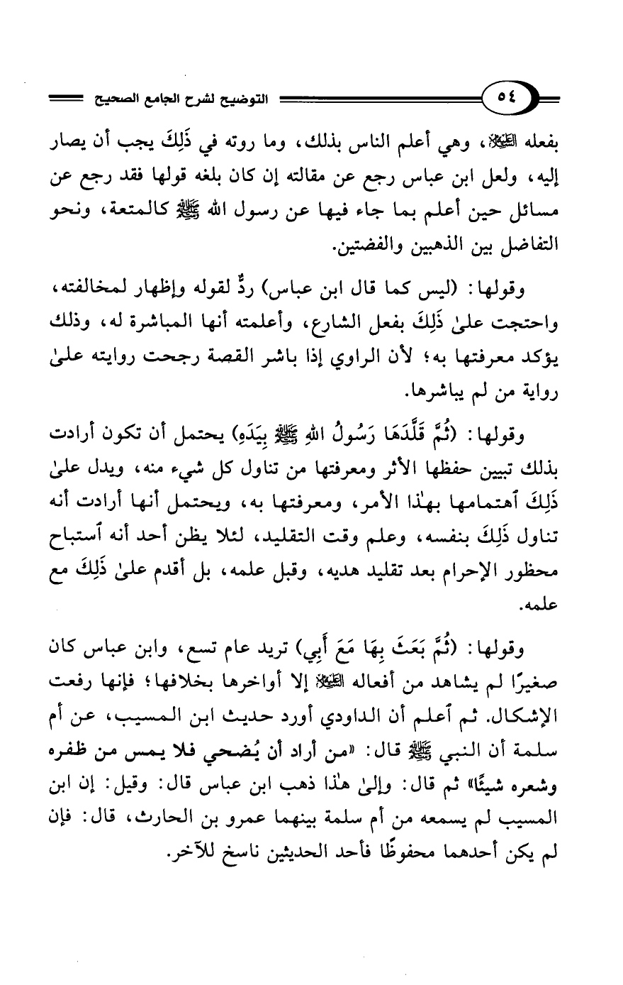 بفعله - عليه السلام -، وهي أعلم الناس بذلك، وما روته في ذَلِكَ يجب أن يصار إليه، ولعل ابن عباس رجع عن مقالته إن كان بلغه قولها فقد رجع عن مسائل حين أعلم بما جاء فيها عن رسول الله - صلى الله عليه وسلم - كالمتعة، ونحو التفاضل بين الذهبين والفضتين.