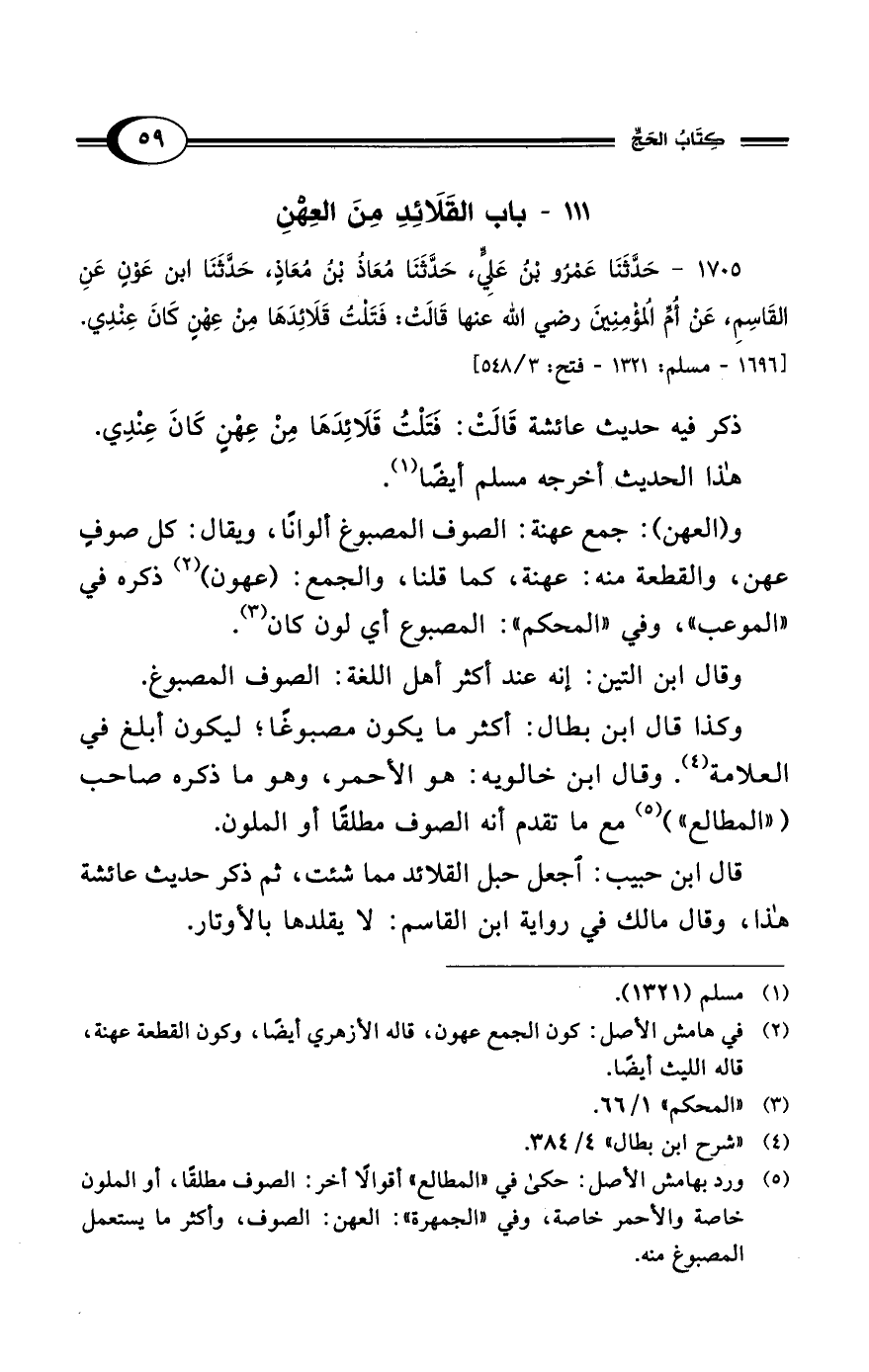 1705 - حَدَّثَنَا عَمْرُو بْنُ عَلِيٍّ، حَدَّثَنَا مُعَاذُ بْنُ مُعَاذٍ، حَدَّثَنَا ابْنُ عَوْنٍ عَنِ القَاسِمِ، عَنْ أُمِّ المُؤْمِنِينَ رضي الله عنها قَالَتْ: فَتَلْتُ قَلاَئِدَهَا مِنْ عِهْنٍ كَانَ عِنْدِي. [1696 - مسلم: 1321 - فتح: 3/ 548]