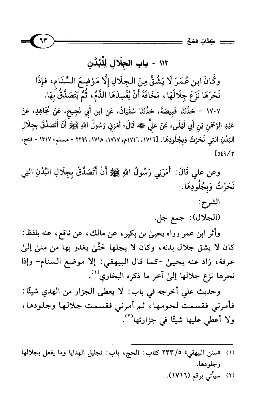 (¬1) "سنن البيهقي" 5/ 233 كتاب: الحج، باب: تجليل الهدايا وما يفعل بجلالها وجلودها.