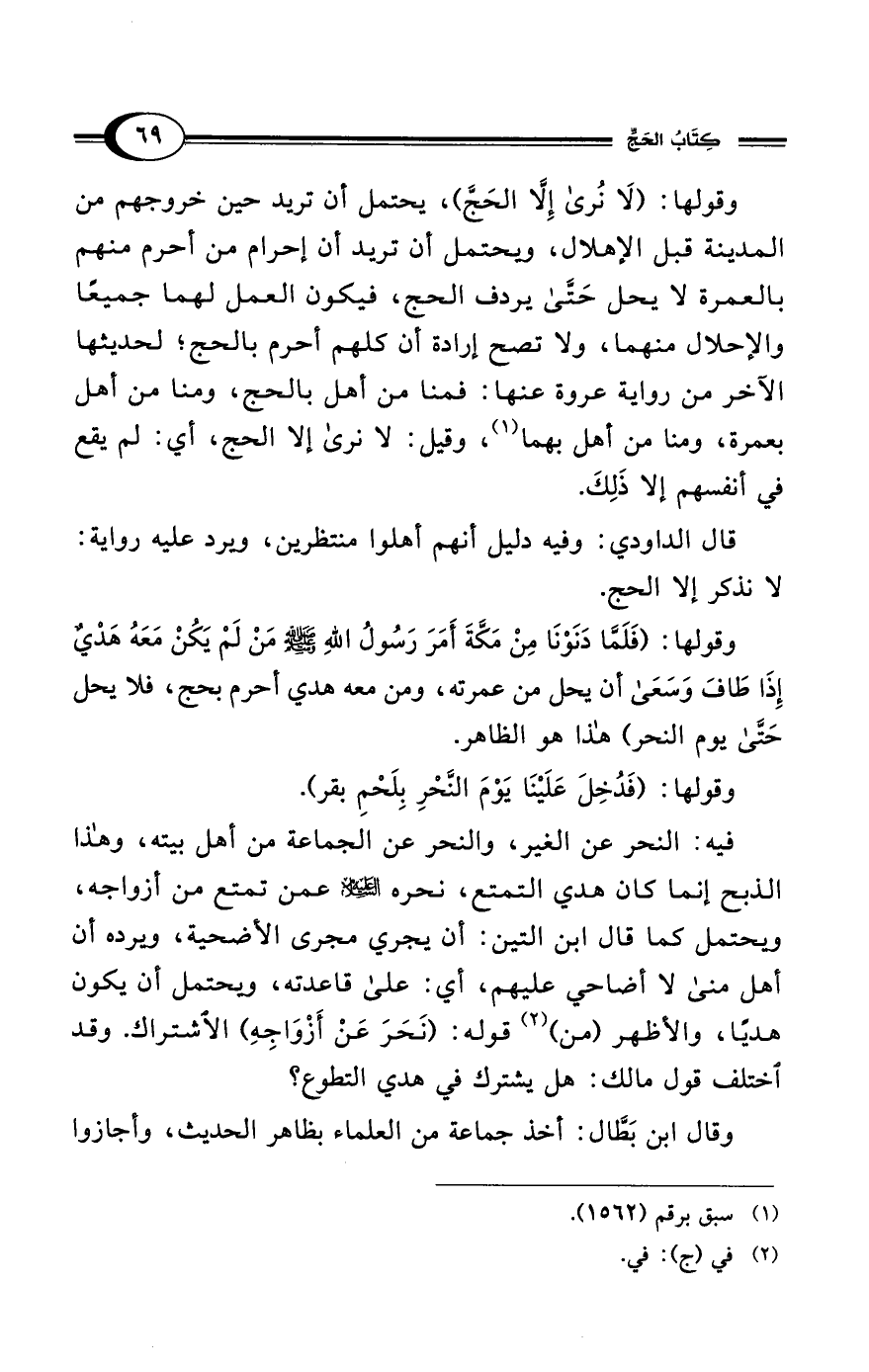 وقولها: (لَا نُرى إِلَّا الحَجَّ)، يحتمل أن تريد حين خروجهم من المدينة قبل الإهلال، ويحتمل أن تريد أن إحرام من أحرم منهم بالعمرة لا يحل حَتَّى يردف الحج، فيكون العمل لهما جميعًا والإحلال منهما، ولا تصح إرادة أن كلهم أحرم بالحج؛ لحديثها الآخر من رواية عروة عنها: فمنا من أهل بالحج، ومنا من أهل بعمرة، ومنا من أهل بهما (¬1)، وقيل: لا نرى إلا الحج، أي: لم يقع في أنفسهم إلا ذَلِكَ.