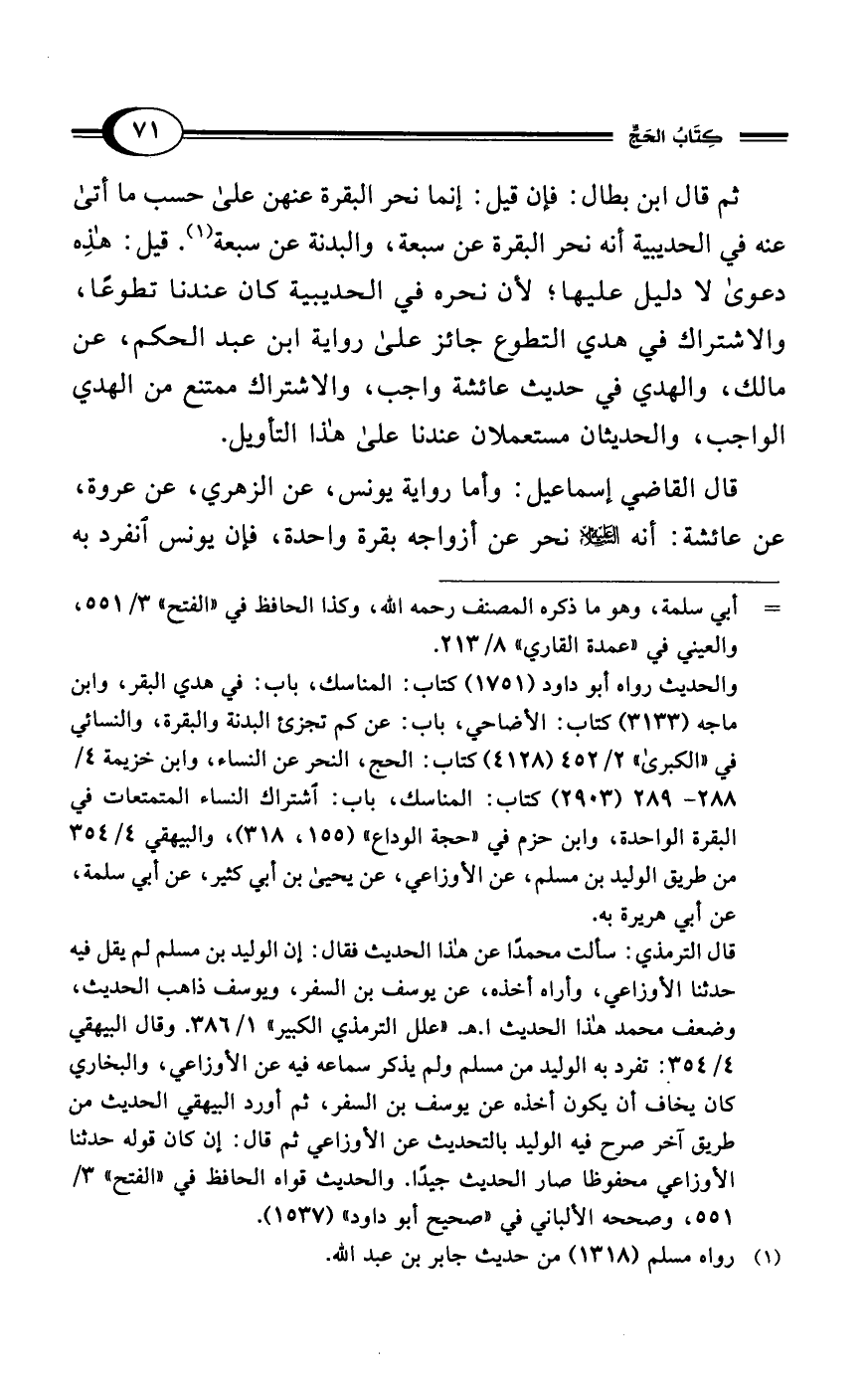 قال القاضي إسماعيل: وأما رواية يونس، عن الزهري، عن عروة، عن عائشة: أنه - عليه السلام - نحر عن أزواجه بقرة واحدة، فإن يونس انفرد به