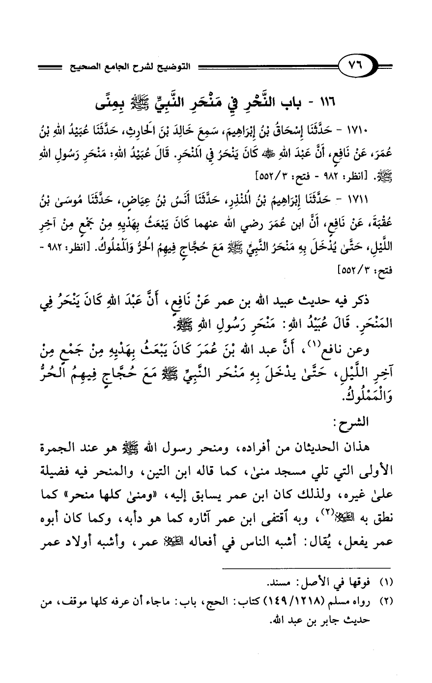 1710 - حَدَّثَنَا إِسْحَاقُ بْنُ إِبْرَاهِيمَ، سَمِعَ خَالِدَ بْنَ الحَارِثِ، حَدَّثَنَا عُبَيْدُ اللهِ بْنُ عُمَرَ، عَنْ نَافِعٍ، أَنَّ عَبْدَ اللهِ - رضي الله عنه - كَانَ يَنْحَرُ فِي المَنْحَرِ. قَالَ عُبَيْدُ اللهِ: مَنْحَرِ رَسُولِ اللهِ - صلى الله عليه وسلم -. [انظر: 982 - فتح: 3/ 552]
