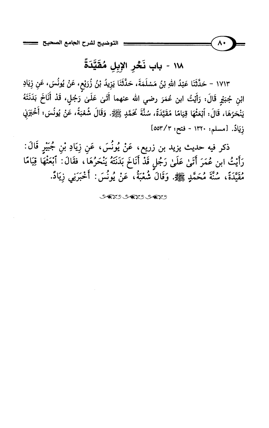1713 - حَدَّثَنَا عَبْدُ اللهِ بْنُ مَسْلَمَةَ، حَدَّثَنَا يَزِيدُ بْنُ زُرَيْعٍ، عَنْ يُونُسَ، عَنِ زِيَادِ ابْنِ جُبَيْرٍ قَالَ: رَأَيْتُ ابْنَ عُمَرَ رضي الله عنهما أَتَى عَلَى رَجُلٍ، قَدْ أَنَاخَ بَدَنَتَهُ يَنْحَرُهَا، قَالَ: ابْعَثْهَا قِيَامًا مُقَيَّدَةً، سُنَّةَ مُحَمَّدٍ - صلى الله عليه وسلم -. وَقَالَ شُعْبَةُ، عَنْ يُونُسَ: أَخْبَرَنِي زِيَادٌ. [مسلم: 1320 - فتح: 3/ 553]