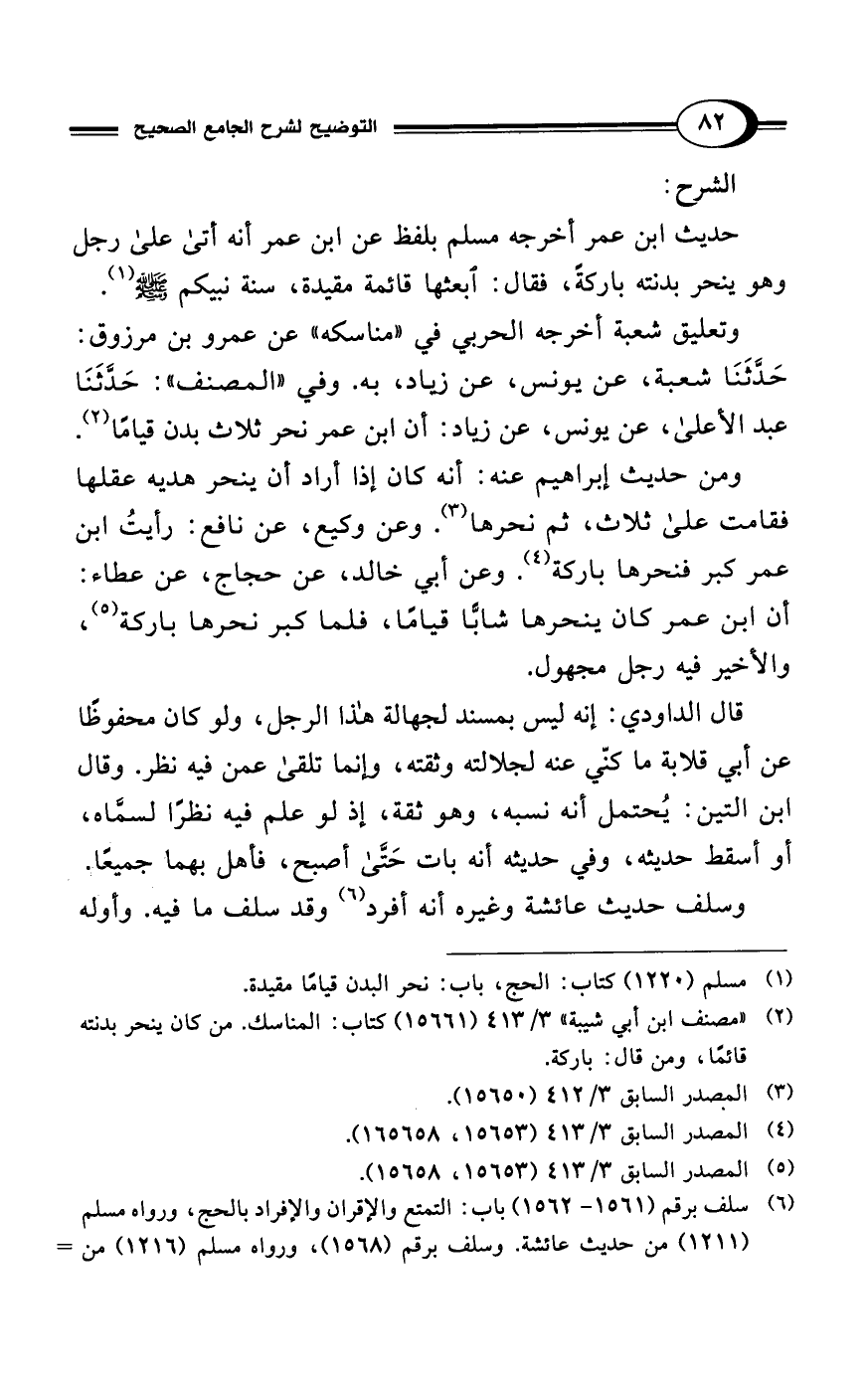(¬2) "مصنف ابن أبي شيبة" 3/ 413 (15661) كتاب: المناسك. من كان ينحر بدنته قائمًا، ومن قال: باركة.