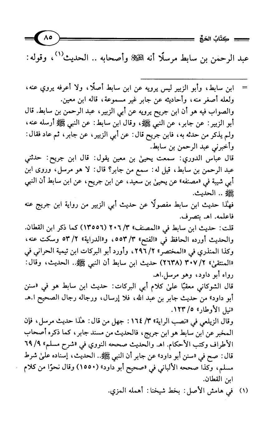 قال عباس الدوري: سمعت يحيى بن معين يقول: قال ابن جريح: حدثني عبد الرحمن بن سابط، قيل له: سمع من جابر؟ قال: لا هو مرسل، وروى ابن أبي شيبة في "مصنفه" عن يحيى بن سعيد، عن ابن جريح، عن ابن سابط أن النبي - صلى الله عليه وسلم - .. الحديث.