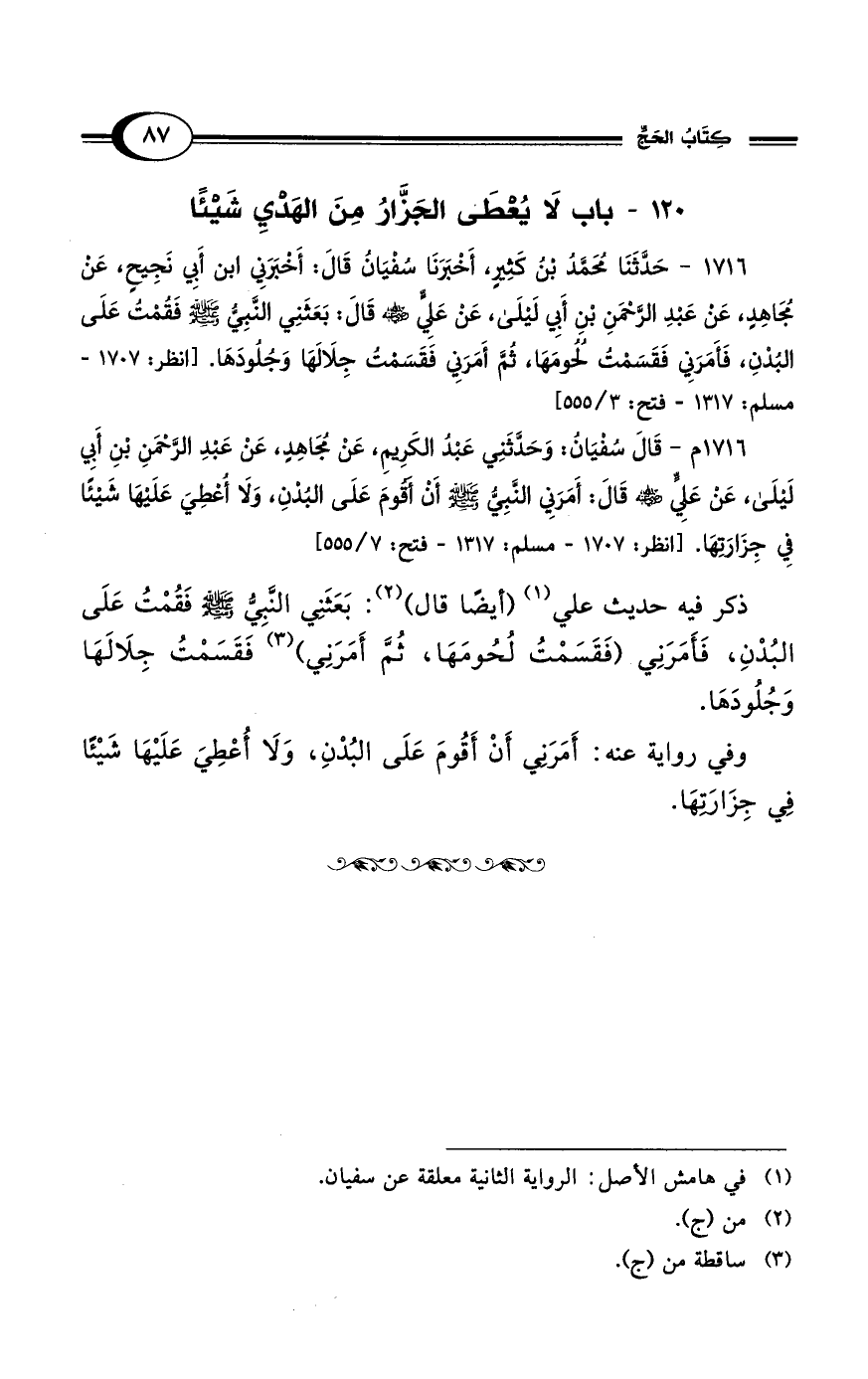 1716 م - قَالَ سُفْيَانُ: وَحَدَّثَنِي عَبْدُ الكَرِيمِ، عَنْ مُجَاهِدٍ، عَنْ عَبْدِ الرَّحْمَنِ بْنِ أَبِي لَيْلَى، عَنْ عَلِيٍّ - رضي الله عنه - قَالَ: أَمَرَنِي النَّبِيُّ - صلى الله عليه وسلم - أَنْ أَقُومَ عَلَى البُدْنِ، وَلاَ أُعْطِيَ عَلَيْهَا شَيْئًا فِي جِزَارَتِهَا. [انظر: 1707 - مسلم: 1317 - فتح: 7/ 555]