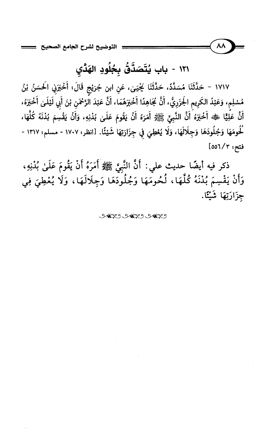1717 - حَدَّثَنَا مُسَدَّدٌ، حَدَّثَنَا يَحْيَى، عَنِ ابْنِ جُرَيْجٍ قَالَ: أَخْبَرَنِي الحَسَنُ بْنُ مُسْلِمٍ، وَعَبْدُ الكَرِيمِ الجَزَرِيُّ، أَنَّ مُجَاهِدًا أَخْبَرَهُمَا، أَنَّ عَبْدَ الرَّحْمَنِ بْنَ أَبِي لَيْلَى أَخْبَرَهُ، أَنَّ عَلِيًّا - رضي الله عنه - أَخْبَرَهُ أَنَّ النَّبِيَّ - صلى الله عليه وسلم - أَمَرَهُ أَنْ يَقُومَ عَلَى بُدْنِهِ، وَأَنْ يَقْسِمَ بُدْنَهُ كُلَّهَا، لُحُومَهَا وَجُلُودَهَا وَجِلاَلَهَا، وَلاَ يُعْطِيَ فِي جِزَارَتِهَا شَيْئًا. [انظر: 1707 - مسلم: 1317 - فتح: 3/ 556]