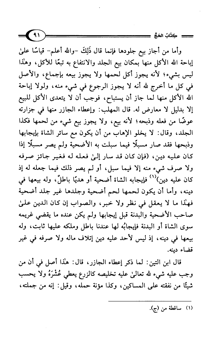 وأما من أجاز بيع جلودها فإنما قال ذَلِكَ -والله أعلم- قياسًا على إباحة الله الأكل منها بمكان بيع الجلد والانتفاع به تبعًا للأكل، وهذا ليس بشيء؛ لأنه يجوز أكل لحمها ولا يجوز بيعه بإجماع، والأصل في كل ما أخرج لله أنه لا يجوز الرجوع في شيء منه، ولولا إباحة الله الأكل منها لما جاز أن يستباح، فوجب أن لا يتعدى الأكل للبيع إلا بدليل لا معارض له. قال المهلب: وإعطاء الجازر منها في جزارته عوضًا من فعله وذبحه؛ لأنه بيع، ولا يجوز بيع شيء من لحمها فكذا الجلد، وقال: لا يخلو الإهاب من أن يكون مع سائر الشاة بإيجابها وذبحها فقد صار مسبلًا فيما سبلت به الأضحية ولم يصر مسبلًا إذا كان عليه دين، (فإن كان قد سار إلى فعله له فغير جائز صرفه ولا صرف شيء منه إلا فيما سبل، أو لم يصر ذلك فيما جعله له إذ كان عليه دين) (¬1) فإيجابه الشاة أضحية أو هديًا باطلٌ، وله بيعها في دينه، وأما أن يكون لحمها لحم أضحية وجلدها غير جلد أضحية فهذا ما لا يعقل في نظر ولا خبر، والصواب إن كان الدين على صاحب الأضحية والبدنة قبل إيجابها ولم يكن عنده ما يقضي غريمه سوى الشاة أو البدنة فإيجابُه لها عندنا باطل وملكه عليها ثابت، وله بيعها في دينه، إذ ليس لأحد عليه دين إتلاف ماله ولا صرفه في غير قضاء دينه.