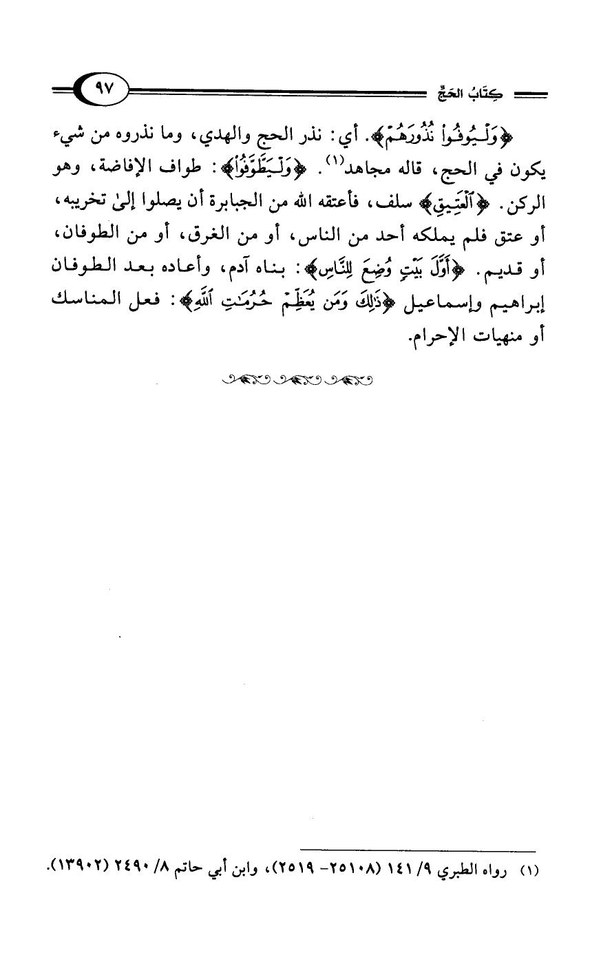 {وَلْيُوفُوا نُذُورَهُمْ}. أي: نذر الحج والهدي، وما نذروه من شيء يكون في الحج، قاله مجاهد (¬1). {وَلْيَطَّوَّفُوا}: طواف الإفاضة، وهو الركن. {العَتِيقِ} سلف، فأعتقه الله من الجبابرة أن يصلوا إلى تخريبه، أو عتق فلم يملكه أحد من الناس، أو من الغرق، أو من الطوفان، أو قديم. {أَوَّلَ بَيْتٍ وُضِعَ لِلنَّاسِ}: بناه آدم، وأعاده بعد الطوفان إبراهيم وإسماعيل {ذَلِكَ وَمَن يُعَظِم حُرُمَتِ اَللهِ}: فعل المناسك أو منهيات الإحرام.