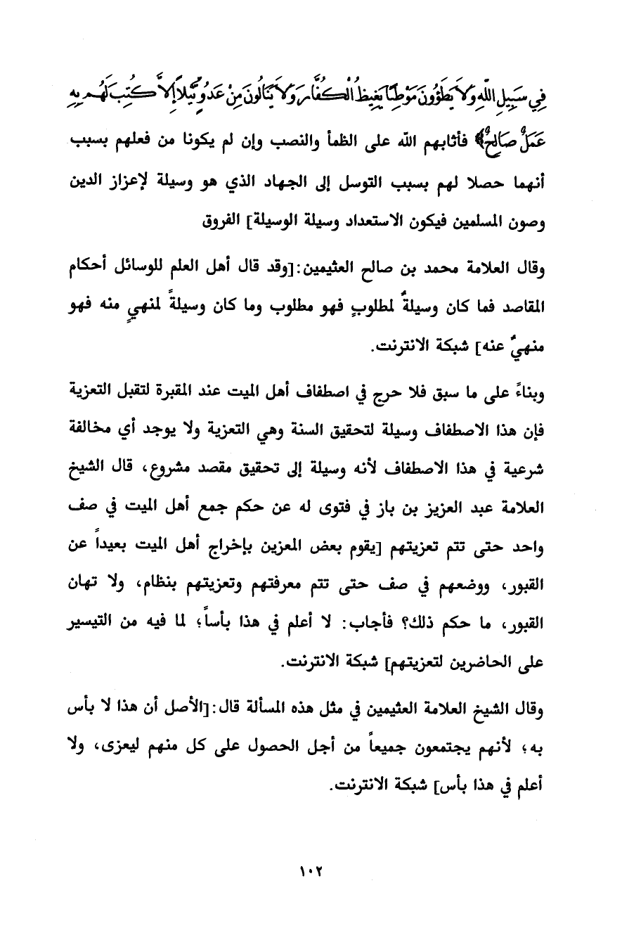 وقال العلامة محمد بن صالح العثيمين: [وقد قال أهل العلم للوسائل أحكام المقاصد فما كان وسيلةٌ لمطلوبٍ فهو مطلوب وما كان وسيلةً لمنهيٍ منه فهو منهيٌ عنه] شبكة الانترنت.