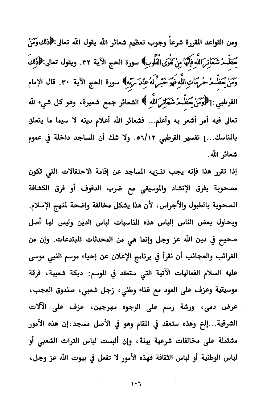 ومن القواعد المقررة شرعاً وجوب تعظيم شعائر الله يقول الله تعالى: {ذلك وَمَنْ يُعَظِّمْ شَعَائِرَ اللَّهِ فَإِنَّهَا مِنْ تَقْوَى الْقُلُوبِ} سورة الحج الآية 32. ويقول تعالى: {ذَلِكَ وَمَنْ يُعَظِّمْ حُرُمَاتِ اللَّهِ فَهُوَ خَيْرٌ لَهُ عِنْدَ رَبِّهِ} سورة الحج الآية 30. قال الإمام القرطبي: [{وَمَنْ يُعَظِّمْ شَعَائِرَ اللَّهِ} الشعائر جمع شعيرة، وهو كل شيء لله تعالى فيه أمر أشعر به وأعلم ... فشعائر الله أعلام دينه لا سيما ما يتعلق بالمناسك ... ] تفسير القرطبي 12/ 56. ولا شك أن المساجد داخلة في عموم شعائر الله.