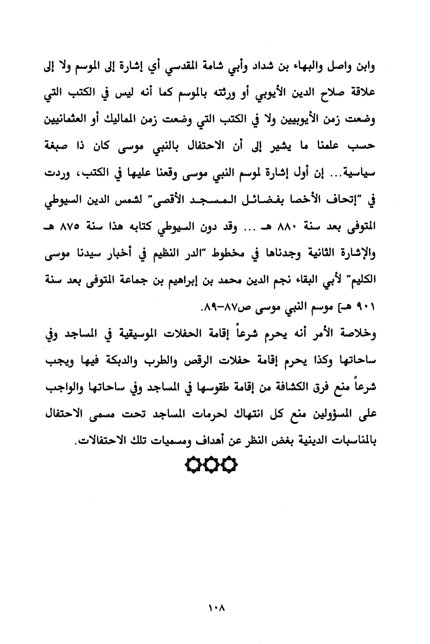 وابن واصل والبهاء بن شداد وأبي شامة المقدسي أي إشارة إلى الموسم ولا إلى علاقة صلاح الدين الأيوبي أو ورثته بالموسم كما أنه ليس في الكتب التي وضعت زمن الأيوبيين ولا في الكتب التي وضعت زمن المماليك أو العثمانيين حسب علمنا ما يشير إلى أن الاحتفال بالنبي موسى كان ذا صبغة سياسية ... إن أول إشارة لموسم النبي موسى وقعنا عليها في الكتب، وردت في "إتحاف الأخصا بفضائل المسجد الأقصى" لشمس الدين السيوطي المتوفى بعد سنة 880 هـ ... وقد دون السيوطي كتابه هذا سنة 875 هـ والإشارة الثانية وجدناها في مخطوط "الدر النظيم في أخبار سيدنا موسى الكليم" لأبي البقاء نجم الدين محمد بن إبراهيم بن جماعة المتوفى بعد سنة 901 هـ] موسم النبي موسى ص87 - 89.