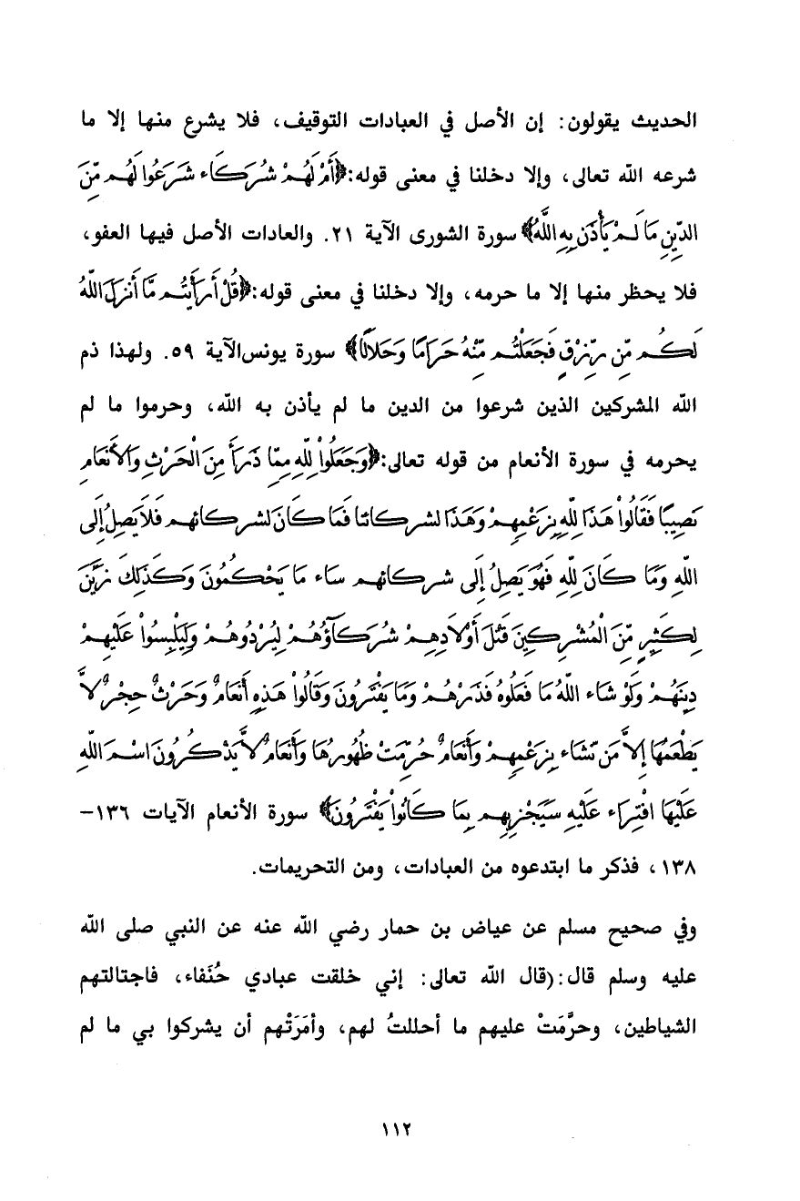 الحديث يقولون: إن الأصل في العبادات التوقيف، فلا يشرع منها إلا ما شرعه الله تعالى، وإلا دخلنا في معنى قوله: {أَمْ لَهُمْ شُرَكَاء شَرَعُوا لَهُم مِّنَ الدِّينِ مَا لَمْ يَأْذَن بِهِ اللَّهُ} سورة الشورى الآية 21. والعادات الأصل فيها العفو، فلا يحظر منها إلا ما حرمه، وإلا دخلنا في معنى قوله: {قُلْ أَرَأَيْتُم مَّا أَنزَلَ اللهُ لَكُم مِّن رِّزْقٍ فَجَعَلْتُم مِّنْهُ حَرَامًا وَحَلاَلًا} سورة يونس الآية 59. ولهذا ذم الله المشركين الذين شرعوا من الدين ما لم يأذن به الله، وحرموا ما لم يحرمه في سورة الأنعام من قوله تعالى: {وَجَعَلُواْ لِلّهِ مِمِّا ذَرَأَ مِنَ الْحَرْثِ وَالأَنْعَامِ نَصِيبًا فَقَالُواْ هَذَا لِلّهِ بِزَعْمِهِمْ وَهَذَا لشركائنا فَمَا كَانَ لشركائهم فَلاَ يَصِلُ إِلَى اللهِ وَمَا كَانَ لِلّهِ فَهُوَ يَصِلُ إِلَى شركائهم سَاء مَا يَحْكُمُونَ وَكَذَلِكَ زَيَّنَ لِكَثِيرٍ مِّنَ الْمُشْرِكِينَ قَتْلَ أَوْلاَدِهِمْ شُرَكَآؤُهُمْ لِيُرْدُوهُمْ وَلِيَلْبِسُواْ عَلَيْهِمْ دِينَهُمْ وَلَوْ شَاء اللهُ مَا فَعَلُوهُ فَذَرْهُمْ وَمَا يَفْتَرُونَ وَقَالُواْ هَذِهِ أَنْعَامٌ وَحَرْثٌ حِجْرٌ لاَّ يَطْعَمُهَا إِلاَّ مَن نّشَاء بِزَعْمِهِمْ وَأَنْعَامٌ حُرِّمَتْ ظُهُورُهَا وَأَنْعَامٌ لاَّ يَذْكُرُونَ اسْمَ اللهِ عَلَيْهَا افْتِرَاء عَلَيْهِ سَيَجْزِيهِم بِمَا كَانُواْ يَفْتَرُونَ} سورة الأنعام الآيات 136 - 138، فذكر ما ابتدعوه من العبادات، ومن التحريمات.