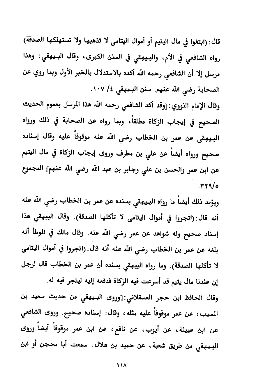 ويؤيد ذلك أيضاً ما رواه البيهقي بسنده عن عمر بن الخطاب رضي الله عنه أنه قال: (اتجروا في أموال اليتامى لا تأكلها الصدقة). وقال البيهقي هذا إسناد صحيح وله شواهد عن عمر رضي الله عنه. وقال مالك في الموطأ أنه بلغه عن عمر بن الخطاب رضي الله عنه أنه قال: (اتجروا في أموال اليتامى لا تأكلها الصدقة). وما رواه البيهقي بسنده أن عمر بن الخطاب قال لرجل إن عندنا مال يتيم قد أسرعت فيه الزكاة فدفعه إليه ليتجر فيه له.