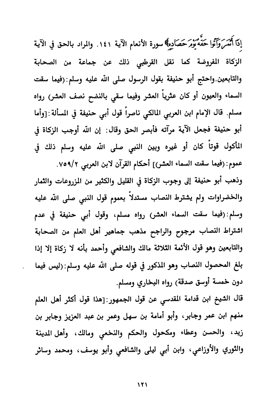 إِذَا أَثْمَرَ وَآتُوا حَقَّهُ يَوْمَ حَصَادِهِ} سورة الأنعام الآية 141. والمراد بالحق في الآية الزكاة المفروضة كما نقل القرطبي ذلك عن جماعة من الصحابة والتابعين. واحتج أبو حنيفة بقول الرسول صلى الله عليه وسلم: (فيما سقت السماء والعيون أو كان عثرياً العشر وفيما سقي بالنضح نصف العشر) رواه مسلم. قال الإمام ابن العربي المالكي ناصراً قول أبي حنيفة في المسألة: [وأما أبو حنيفة فجعل الآية مرآته فأبصر الحق وقال: إن الله أوجب الزكاة في المأكول قوتاً كان أو غيره وبين النبي صلى الله عليه وسلم ذلك في عموم: (فيما سقت السماء العشر)] أحكام القرآن لابن العربي 2/ 759.