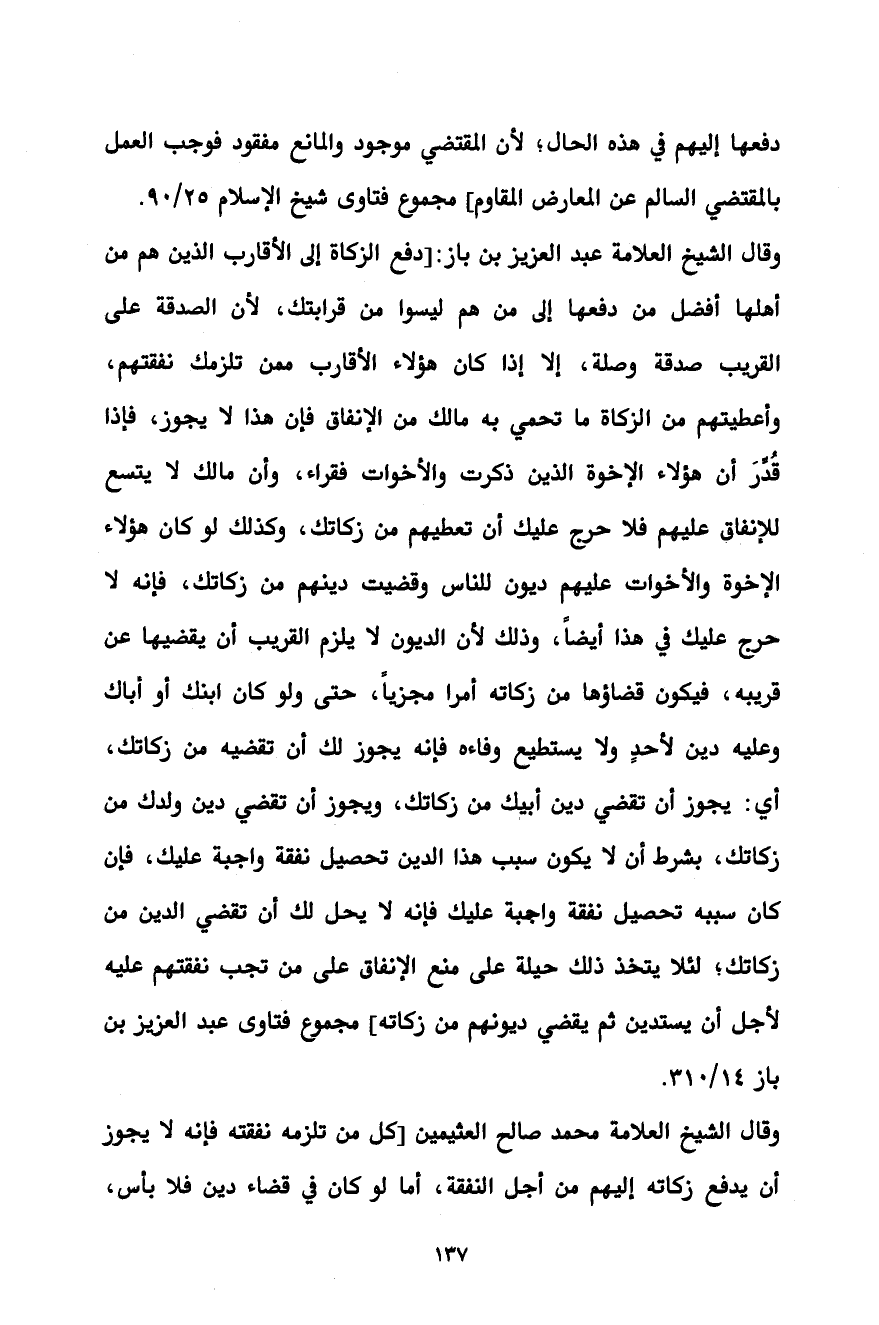 وقال الشيخ العلامة محمد صالح العثيمين [كل من تلزمه نفقته فإنه لا يجوز أن يدفع زكاته إليهم من أجل النفقة، أما لو كان في قضاء دين فلا بأس،