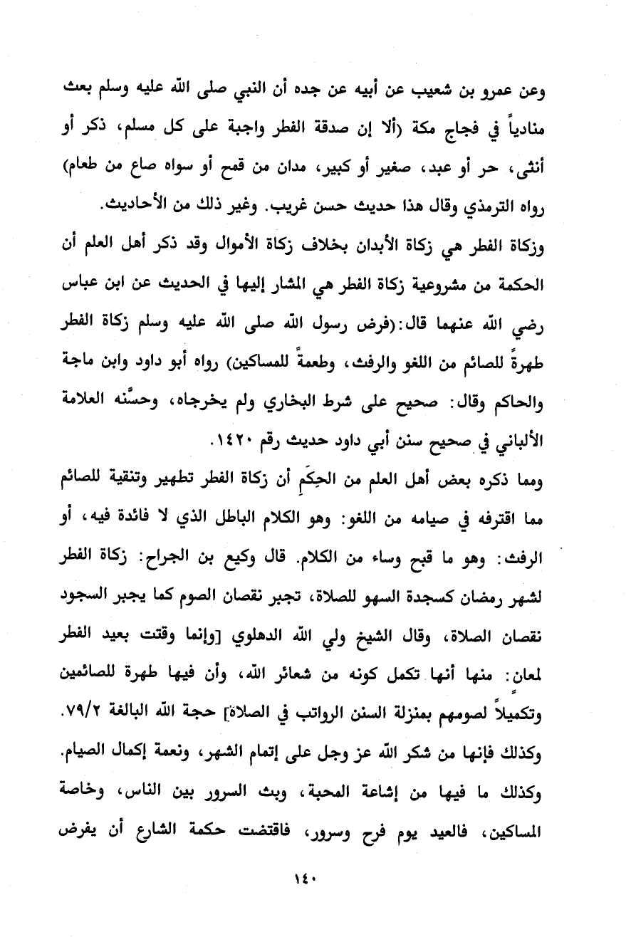 وعن عمرو بن شعيب عن أبيه عن جده أن النبي صلى الله عليه وسلم بعث منادياً في فجاج مكة (ألا إن صدقة الفطر واجبة على كل مسلم، ذكر أو أنثى، حر أو عبد، صغير أو كبير، مدان من قمح أو سواه صاع من طعام) رواه الترمذي وقال هذا حديث حسن غريب. وغير ذلك من الأحاديث.