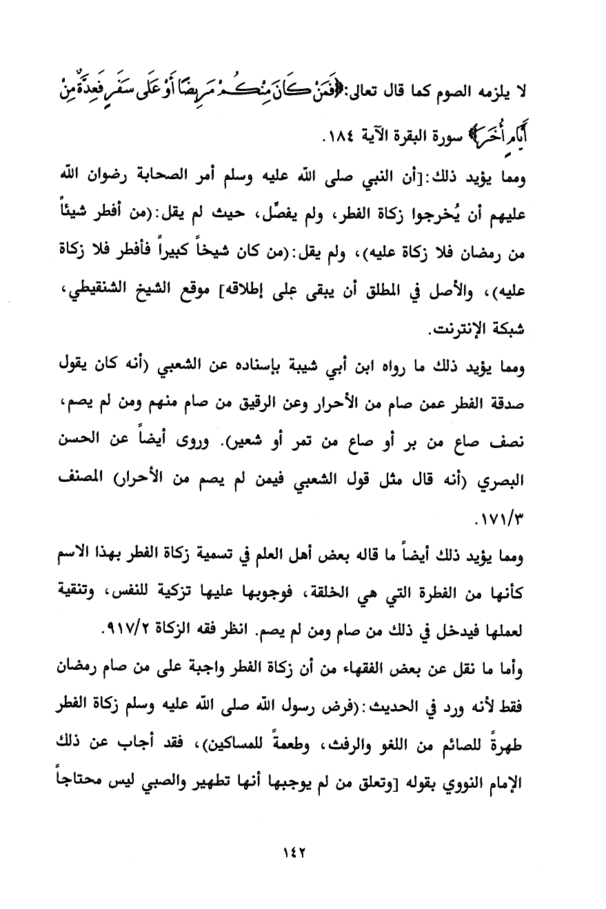 ومما يؤيد ذلك: [أن النبي صلى الله عليه وسلم أمر الصحابة رضوان الله عليهم أن يُخرجوا زكاة الفطر، ولم يفصِّل، حيث لم يقل: (من أفطر شيئاً من رمضان فلا زكاة عليه)، ولم يقل: (من كان شيخاً كبيراً فأفطر فلا زكاة عليه)، والأصل في المطلق أن يبقى على إطلاقه] موقع الشيخ الشنقيطي، شبكة الإنترنت.