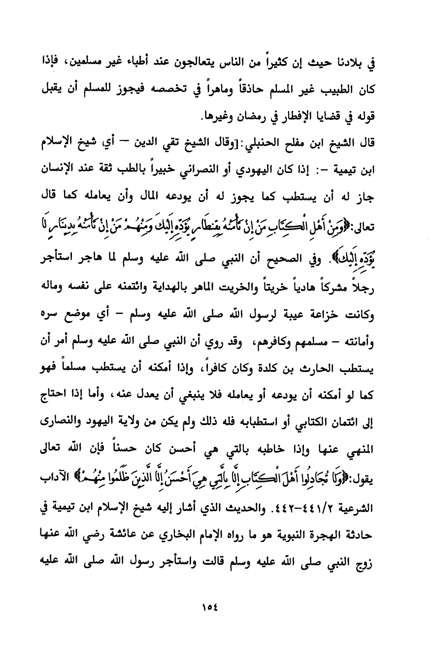 قال الشيخ ابن مفلح الحنبلي: [وقال الشيخ تقي الدين – أي شيخ الإسلام ابن تيمية -: إذا كان اليهودي أو النصراني خبيراً بالطب ثقة عند الإنسان جاز له أن يستطب كما يجوز له أن يودعه المال وأن يعامله كما قال تعالى: {وَمِنْ أَهْلِ الْكِتَابِ مَنْ إِنْ تَأْمَنْهُ بِقِنطَارٍ يُؤَدِّهِ إِلَيْكَ وَمِنْهُمْ مَنْ إِنْ تَأْمَنْهُ بِدِينَارٍ لَا يُؤَدِّهِ إِلَيْكَ}. وفي الصحيح أن النبي صلى الله عليه وسلم لما هاجر استأجر رجلاً مشركاً هادياً خريتاً والخريت الماهر بالهداية وائتمنه على نفسه وماله وكانت خزاعة عيبة لرسول الله صلى الله عليه وسلم - أي موضع سره وأمانته - مسلمهم وكافرهم، وقد روي أن النبي صلى الله عليه وسلم أمر أن يستطب الحارث بن كلدة وكان كافراً، وإذا أمكنه أن يستطب مسلماً فهو كما لو أمكنه أن يودعه أو يعامله فلا ينبغي أن يعدل عنه، وأما إذا احتاج إلى ائتمان الكتابي أو استطبابه فله ذلك ولم يكن من ولاية اليهود والنصارى المنهي عنها وإذا خاطبه بالتي هي أحسن كان حسناً فإن الله تعالى يقول: {وَلَا تُجَادِلُوا أَهْلَ الْكِتَابِ إِلَّا بِالَّتِي هِيَ أَحْسَنُ إِلَّا الَّذِينَ ظَلَمُوا مِنْهُمْ} الآداب الشرعية 2/ 441 - 442. والحديث الذي أشار إليه شيخ الإسلام ابن تيمية في حادثة الهجرة النبوية هو ما رواه الإمام البخاري عن عائشة رضي الله عنها زوج النبي صلى الله عليه وسلم قالت واستأجر رسول الله صلى الله عليه
