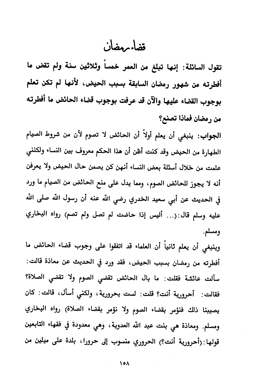 وينبغي أن يعلم ثانياً أن العلماء قد اتفقوا على وجوب قضاء الحائض ما أفطرته من رمضان بسبب الحيض، فقد ورد في الحديث عن معاذة قالت: سألت عائشة فقلت: ما بال الحائض تقضي الصوم ولا تقضي الصلاة؟ فقالت: أحرورية أنت؟ قلت: لست بحرورية، ولكني أسأل، قالت: كان يصيبنا ذلك فنؤمر بقضاء الصوم ولا نؤمر بقضاء الصلاة) رواه البخاري ومسلم. ومعاذة هي بنت عبد الله العدوية، وهي معدودة في فقهاء التابعين قولها: (أحرورية أنت؟) الحروري منسوب إلى حرورا، بلدة على ميلين من