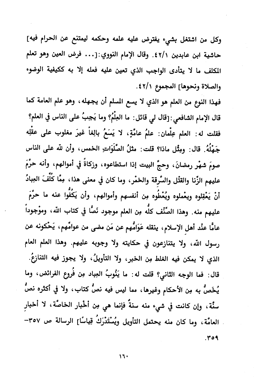 فهذا النوع من العلم هو الذي لا يسع المسلم أن يجهله، وهو علم العامة كما قال الإمام الشافعي: [قال لي قائل: ما العِلْمُ؟ وما يَجِبُ على الناس في العلم؟ فقلت له: العلم عِلْمان: علمُ عامَّةٍ، لا يَسَعُ بالِغاً غيرَ مغلوب على عقْلِه جَهْلُهُ. قال: ومِثْل ماذا؟ قلت: مثلُ الصَّلَوَاتِ الخمس، وأن لله على الناس صومَ شهْر رمضانَ، وحجَّ البيت إذا استطاعوه، وزكاةً في أموالهم، وأنه حرَّمَ عليهم الزِّنا والقتْل والسَّرِقة والخمْر، وما كان في معنى هذا، مِمَّا كُلِّفَ العِبادُ أنْ يَعْقِلوه ويعْملوه ويُعْطُوه مِن أنفسهم وأموالهم، وأن يَكُفُّوا عنه ما حرَّمَ عليهم منه. وهذا الصِّنْف كلُّه مِن العلم موجود نَصًّا في كتاب الله، وموْجوداً عامًّا عنْد أهلِ الإسلام، ينقله عَوَامُّهم عن مَن مضى من عوامِّهم، يَحْكونه عن رسول الله، ولا يتنازعون في حكايته ولا وجوبه عليهم. وهذا العلم العام الذي لا يمكن فيه الغلط مِن الخبر، ولا التأويلُ، ولا يجوز فيه التنازعُ. قال: فما الوجه الثاني؟ قلت له: ما يَنُوبُ العِباد مِن فُروع الفرائض، وما يُخَصُّ به مِن الأحكام وغيرها، مما ليس فيه نصُّ كتاب، ولا في أكثره نصُّ سنَّة، وإن كانت في شيء منه سنةٌ فإنما هي مِن أخْبار الخاصَّة، لا أخبارِ العامَّة، وما كان منه يحتمل التأويل ويُسْتَدْرَكُ قِياسًا] الرسالة ص 357 - 359.