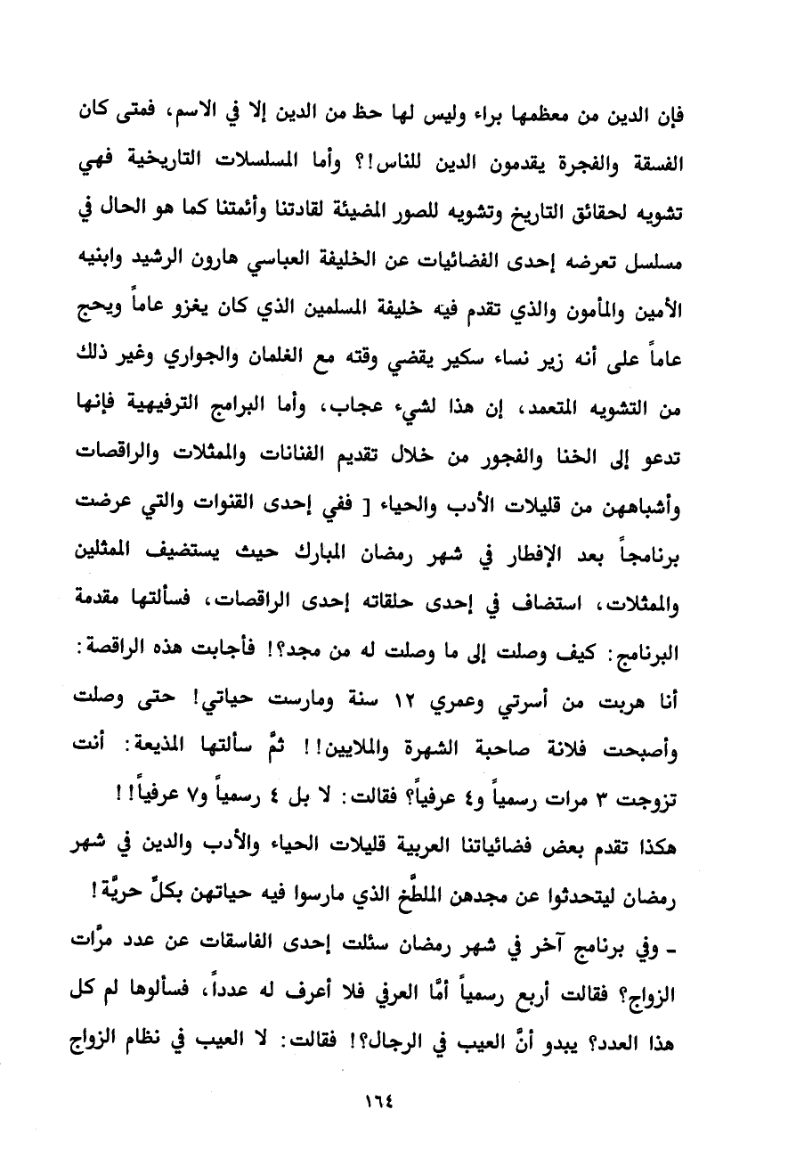 ـ وفي برنامج آخر في شهر رمضان سئلت إحدى الفاسقات عن عدد مرَّات الزواج؟ فقالت أربع رسمياً أمَّا العرفي فلا أعرف له عدداً، فسألوها لم كل هذا العدد؟ يبدو أنَّ العيب في الرجال؟! فقالت: لا العيب في نظام الزواج