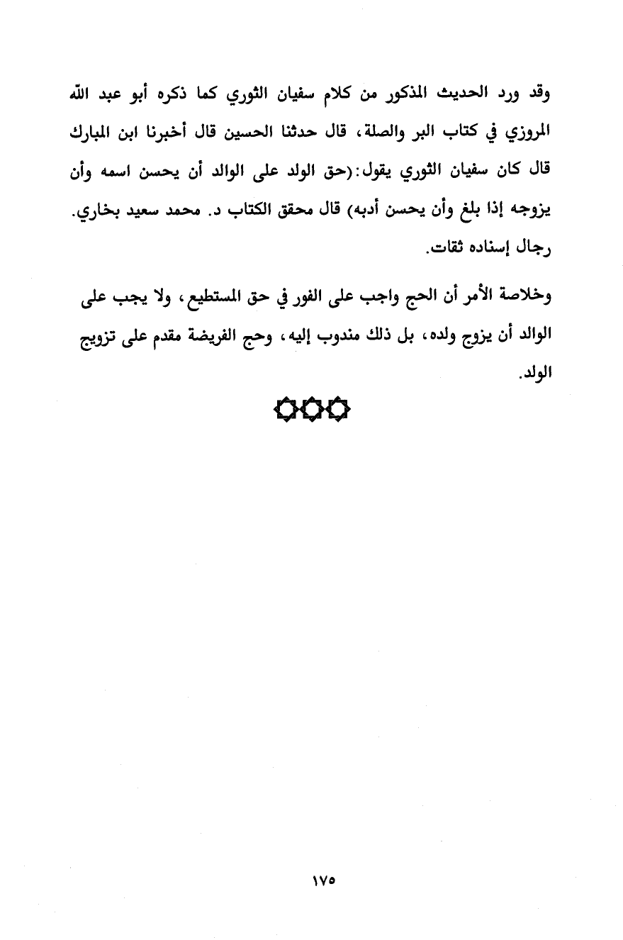 وقد ورد الحديث المذكور من كلام سفيان الثوري كما ذكره أبو عبد الله المروزي في كتاب البر والصلة، قال حدثنا الحسين قال أخبرنا ابن المبارك قال كان سفيان الثوري يقول: (حق الولد على الوالد أن يحسن اسمه وأن يزوجه إذا بلغ وأن يحسن أدبه) قال محقق الكتاب د. محمد سعيد بخاري. رجال إسناده ثقات.
