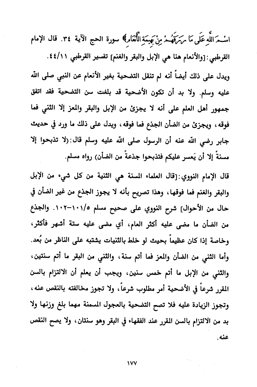 ويدل على ذلك أيضاً أنه لم تنقل التضحية بغير الأنعام عن النبي صلى الله عليه وسلم. ولا بد أن تكون الأضحية قد بلغت سن التضحية فقد اتفق جمهور أهل العلم على أنه لا يجزئ من الإبل والبقر والمعز إلا الثني فما فوقه، ويجزئ من الضأن الجذع فما فوقه، ويدل على ذلك ما ورد في حديث جابر رضي الله عنه أن الرسول صلى الله عليه وسلم قال: (لا تذبحوا إلا مسنةً إلا أن يَعسر عليكم فتذبحوا جذعةً من الضأن) رواه مسلم.