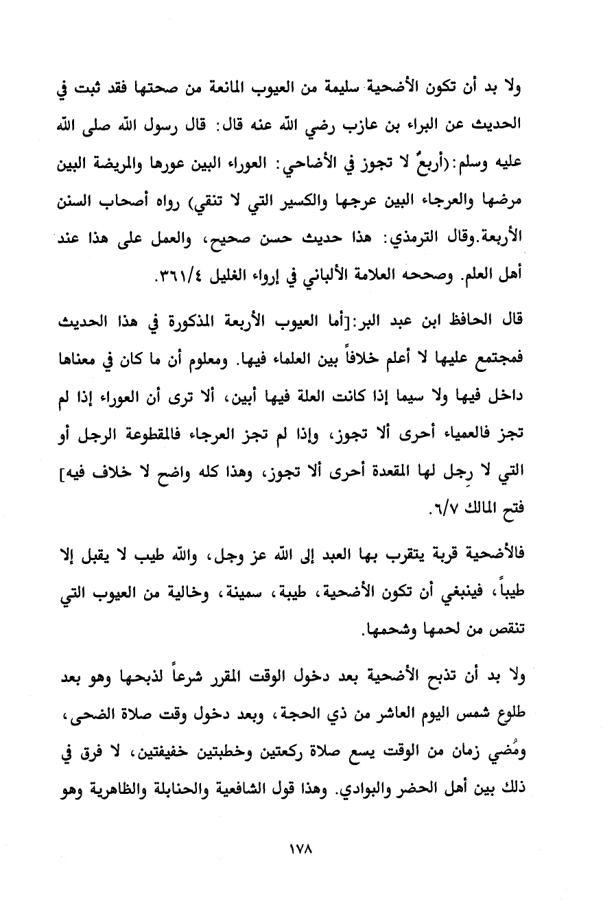 قال الحافظ ابن عبد البر: [أما العيوب الأربعة المذكورة في هذا الحديث فمجتمع عليها لا أعلم خلافاً بين العلماء فيها. ومعلوم أن ما كان في معناها داخل فيها ولا سيما إذا كانت العلة فيها أبين، ألا ترى أن العوراء إذا لم تجز فالعمياء أحرى ألا تجوز، وإذا لم تجز العرجاء فالمقطوعة الرجل أو التي لا رِجل لها المقعدة أحرى ألا تجوز، وهذا كله واضح لا خلاف فيه] فتح المالك 7/ 6.