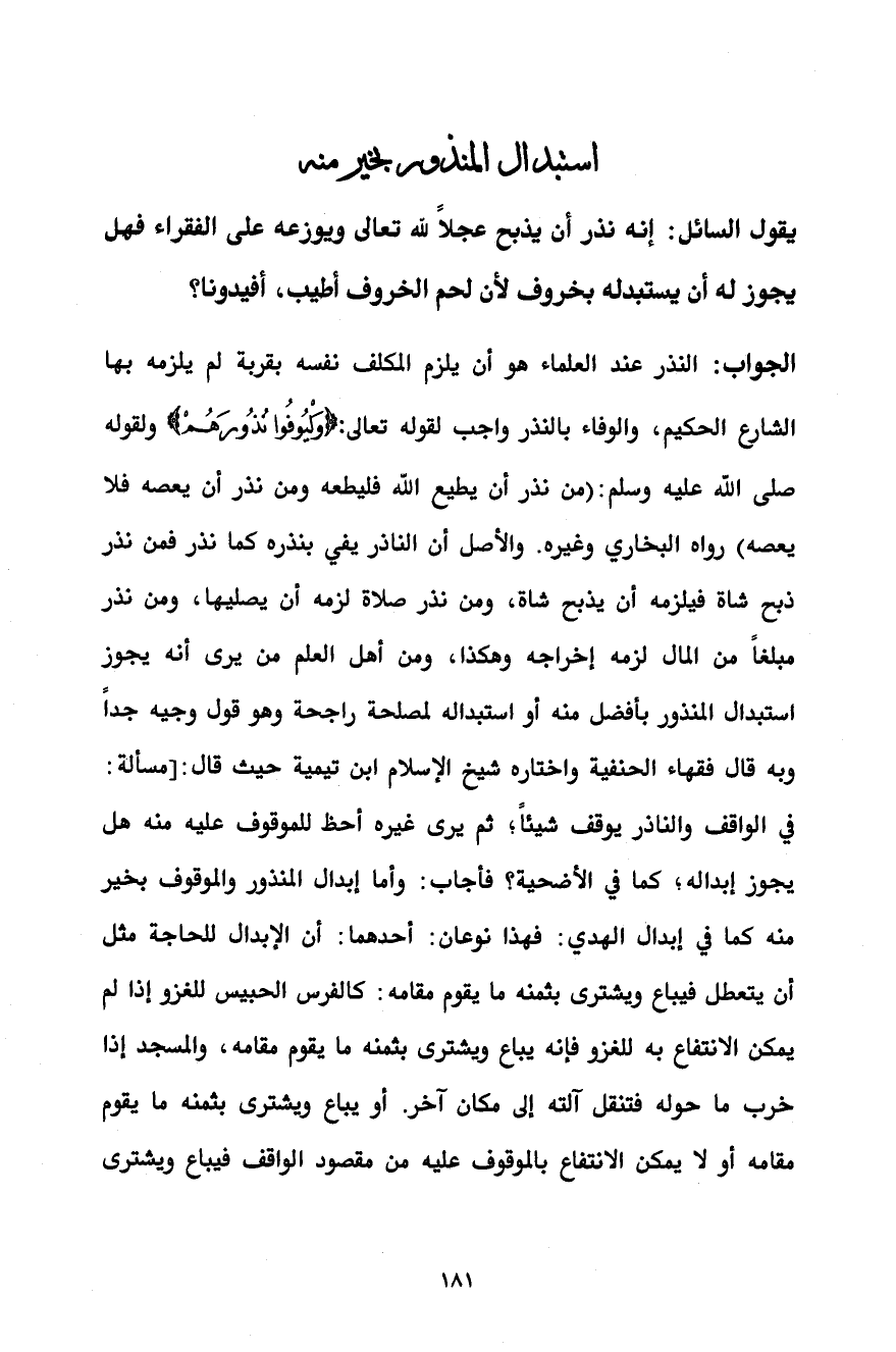 الجواب: النذر عند العلماء هو أن يلزم المكلف نفسه بقربة لم يلزمه بها الشارع الحكيم، والوفاء بالنذر واجب لقوله تعالى: {وَلْيُوفُوا نُذُورَهُمْ} ولقوله صلى الله عليه وسلم: (من نذر أن يطيع الله فليطعه ومن نذر أن يعصه فلا يعصه) رواه البخاري وغيره. والأصل أن الناذر يفي بنذره كما نذر فمن نذر ذبح شاة فيلزمه أن يذبح شاة، ومن نذر صلاة لزمه أن يصليها، ومن نذر مبلغاً من المال لزمه إخراجه وهكذا، ومن أهل العلم من يرى أنه يجوز استبدال المنذور بأفضل منه أو استبداله لمصلحة راجحة وهو قول وجيه جداً وبه قال فقهاء الحنفية واختاره شيخ الإسلام ابن تيمية حيث قال: [مسألة: في الواقف والناذر يوقف شيئاً؛ ثم يرى غيره أحظ للموقوف عليه منه هل يجوز إبداله؛ كما في الأضحية؟ فأجاب: وأما إبدال المنذور والموقوف بخير منه كما في إبدال الهدي: فهذا نوعان: أحدهما: أن الإبدال للحاجة مثل أن يتعطل فيباع ويشترى بثمنه ما يقوم مقامه: كالفرس الحبيس للغزو إذا لم يمكن الانتفاع به للغزو فإنه يباع ويشترى بثمنه ما يقوم مقامه، والمسجد إذا خرب ما حوله فتنقل آلته إلى مكان آخر. أو يباع ويشترى بثمنه ما يقوم مقامه أو لا يمكن الانتفاع بالموقوف عليه من مقصود الواقف فيباع ويشترى