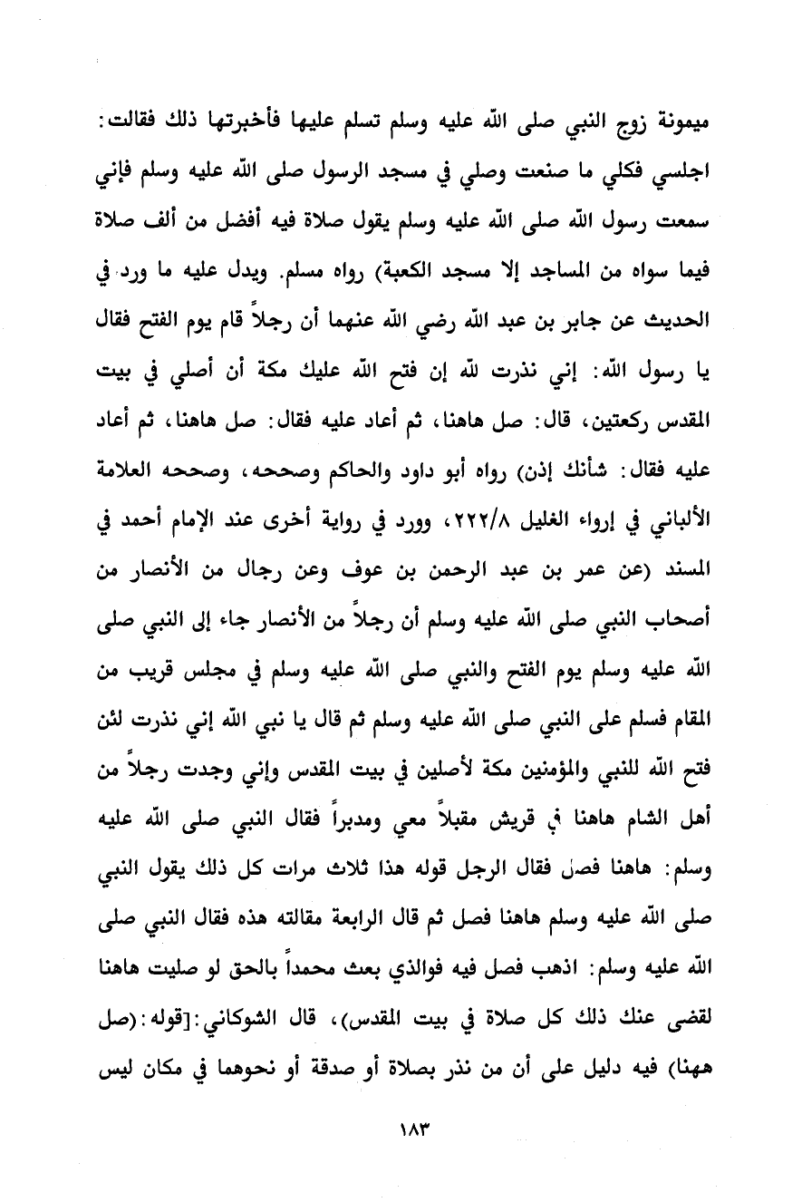 ميمونة زوج النبي صلى الله عليه وسلم تسلم عليها فأخبرتها ذلك فقالت: اجلسي فكلي ما صنعت وصلي في مسجد الرسول صلى الله عليه وسلم فإني سمعت رسول الله صلى الله عليه وسلم يقول صلاة فيه أفضل من ألف صلاة فيما سواه من المساجد إلا مسجد الكعبة) رواه مسلم. ويدل عليه ما ورد في الحديث عن جابر بن عبد الله رضي الله عنهما أن رجلاً قام يوم الفتح فقال يا رسول الله: إني نذرت لله إن فتح الله عليك مكة أن أصلي في بيت المقدس ركعتين، قال: صل هاهنا، ثم أعاد عليه فقال: صل هاهنا، ثم أعاد عليه فقال: شأنك إذن) رواه أبو داود والحاكم وصححه، وصححه العلامة الألباني في إرواء الغليل 8/ 222، وورد في رواية أخرى عند الإمام أحمد في المسند (عن عمر بن عبد الرحمن بن عوف وعن رجال من الأنصار من أصحاب النبي صلى الله عليه وسلم أن رجلاً من الأنصار جاء إلى النبي صلى الله عليه وسلم يوم الفتح والنبي صلى الله عليه وسلم في مجلس قريب من المقام فسلم على النبي صلى الله عليه وسلم ثم قال يا نبي الله إني نذرت لئن فتح الله للنبي والمؤمنين مكة لأصلين في بيت المقدس وإني وجدت رجلاً من أهل الشام هاهنا في قريش مقبلاً معي ومدبراً فقال النبي صلى الله عليه وسلم: هاهنا فصل فقال الرجل قوله هذا ثلاث مرات كل ذلك يقول النبي صلى الله عليه وسلم هاهنا فصل ثم قال الرابعة مقالته هذه فقال النبي صلى الله عليه وسلم: اذهب فصل فيه فوالذي بعث محمداً بالحق لو صليت هاهنا لقضى عنك ذلك كل صلاة في بيت المقدس)، قال الشوكاني: [قوله: (صل ههنا) فيه دليل على أن من نذر بصلاة أو صدقة أو نحوهما في مكان ليس