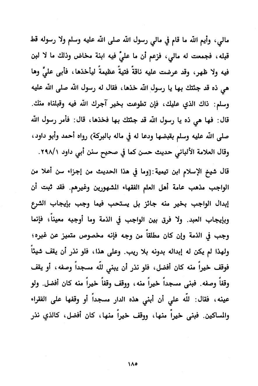 قال شيخ الإسلام ابن تيمية: [وما في هذا الحديث من إجزاء سن أعلا من الواجب مذهب عامة أهل العلم الفقهاء المشهورين وغيرهم. فقد ثبت أن إبدال الواجب بخير منه جائز بل يستحب فيما وجب بإيجاب الشرع وبإيجاب العبد. ولا فرق بين الواجب في الذمة وما أوجبه معيناً؛ فإنما وجب في الذمة وإن كان مطلقاً من وجه فإنه مخصوص متميز عن غيره؛ ولهذا لم يكن له إبداله بدونه بلا ريب. وعلى هذا، فلو نذر أن يقف شيئاً فوقف خيراً منه كان أفضل، فلو نذر أن يبني لله مسجداً وصفه، أو يقف وقفاً وصفه. فبنى مسجداً خيراً منه، ووقف وقفاً خيراً منه كان أفضل. ولو عينه، فقال: لله علي أن أبني هذه الدار مسجداً أو وقفها على الفقراء والمساكين. فبنى خيراً منها، ووقف خيراً منها، كان أفضل، كالذي نذر