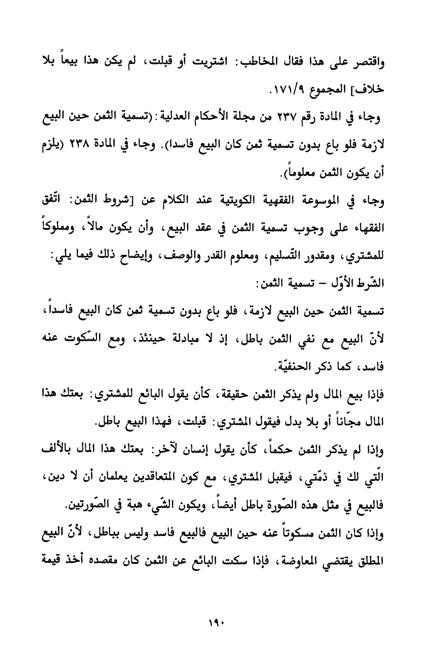 وجاء في المادة رقم 237 من مجلة الأحكام العدلية: (تسمية الثمن حين البيع لازمة فلو باع بدون تسمية ثمن كان البيع فاسدا). وجاء في المادة 238 (يلزم أن يكون الثمن معلوماً).