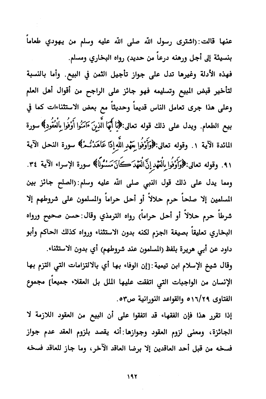 وقال شيخ الإسلام ابن تيمية: [إن الوفاء بها أي بالالتزامات التي التزم بها الإنسان من الواجبات التي اتفقت عليها الملل بل العقلاء جميعاً] مجموع الفتاوى 29/ 516 والقواعد النورانية ص53.