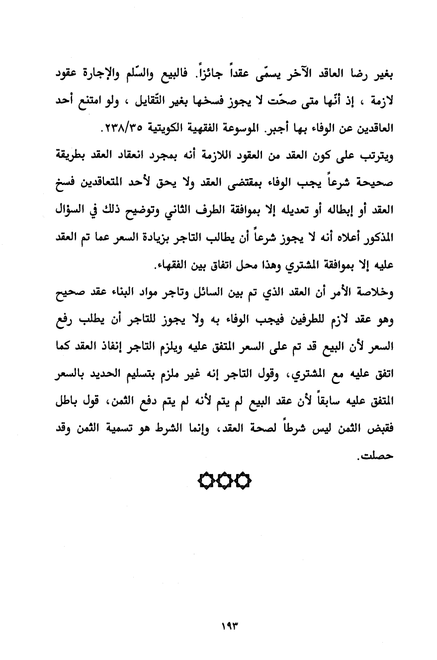 وخلاصة الأمر أن العقد الذي تم بين السائل وتاجر مواد البناء عقد صحيح وهو عقد لازم للطرفين فيجب الوفاء به ولا يجوز للتاجر أن يطلب رفع السعر لأن البيع قد تم على السعر المتفق عليه ويلزم التاجر إنفاذ العقد كما اتفق عليه مع المشتري، وقول التاجر إنه غير ملزم بتسليم الحديد بالسعر المتفق عليه سابقاً لأن عقد البيع لم يتم لأنه لم يتم دفع الثمن، قول باطل فقبض الثمن ليس شرطاً لصحة العقد، وإنما الشرط هو تسمية الثمن وقد حصلت.