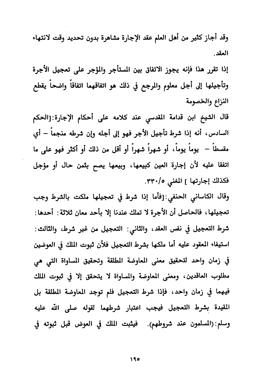 وقال الكاساني الحنفي: [فأما إذا شرط في تعجيلها ملكت بالشرط وجب تعجيلها، فالحاصل أن الأجرة لا تملك عندنا إلا بأحد معان ثلاثة: أحدها: شرط التعجيل في نفس العقد، والثاني: التعجيل من غير شرط، والثالث: استيفاء المعقود عليه أما ملكها بشرط التعجيل فلأن ثبوت الملك في العوضين في زمان واحد لتحقيق معنى المعاوضة المطلقة وتحقيق المساواة التي هي مطلوب العاقدين، ومعنى المعاوضة والمساواة لا يتحقق إلا في ثبوت الملك فيهما في زمان واحد، فإذا شرط التعجيل فلم توجد المعاوضة المطلقة بل المقيدة بشرط التعجيل فيجب اعتبار شرطهما لقوله صلى الله عليه وسلم: (المسلمون عند شروطهم). فيثبت الملك في العوض قبل ثبوته في