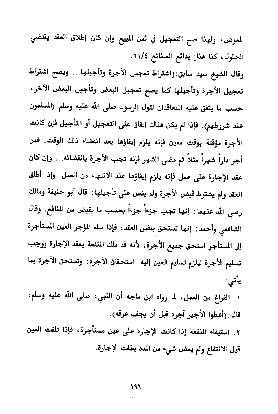 وقال الشيخ سيد سابق: [اشتراط تعجيل الأجرة وتأجيلها ... ويصح اشتراط تعجيل الأجرة وتأجيلها كما يصح تعجيل البعض وتأجيل البعض الآخر، حسب ما يتفق عليه المتعاقدان لقول الرسول صلى الله عليه وسلم: (المسلمون عند شروطهم). فإذا لم يكن هناك اتفاق على التعجيل أو التأجيل فإن كانت الأجرة مؤقتة بوقت معين فإنه يلزم إيفاؤها بعد انقضاء ذلك الوقت. فمن أجر داراً شهراً مثلاً ثم مضى الشهر فإنه تجب الأجرة بانقضائه ... وإن كان عقد الإجارة على عمل فإنه يلزم إيفاؤها عند الانتهاء من العمل. وإذا أطلق العقد ولم يشترط قبض الأجرة ولم ينص على تأجيلها: قال أبو حنيفة ومالك رضي الله عنهما: إنها تجب جزءاً جزءاً بحسب ما يقبض من المنافع. وقال الشافعي وأحمد: إنها تستحق بنفس العقد، فإذا سلم المؤجر العين المستأجرة إلى المستأجر استحق جميع الأجرة، لأنه قد ملك المنفعة بعقد الإجارة ووجب تسليم الأجرة ليلزم تسليم العين إليه. استحقاق الأجرة: وتستحق الأجرة بما يأتي:
