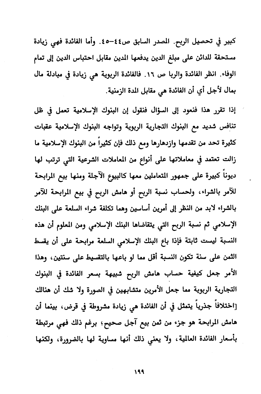 كبير في تحصيل الربح. المصدر السابق ص44 - 45. وأما الفائدة فهي زيادة مستحقة للدائن على مبلغ الدين يدفعها المدين مقابل احتباس الدين إلى تمام الوفاء. انظر الفائدة والربا ص 16. فالفائدة الربوية هي زيادة في مبادلة مال بمال لأجل أي أن الفائدة هي مقابل المدة الزمنية.